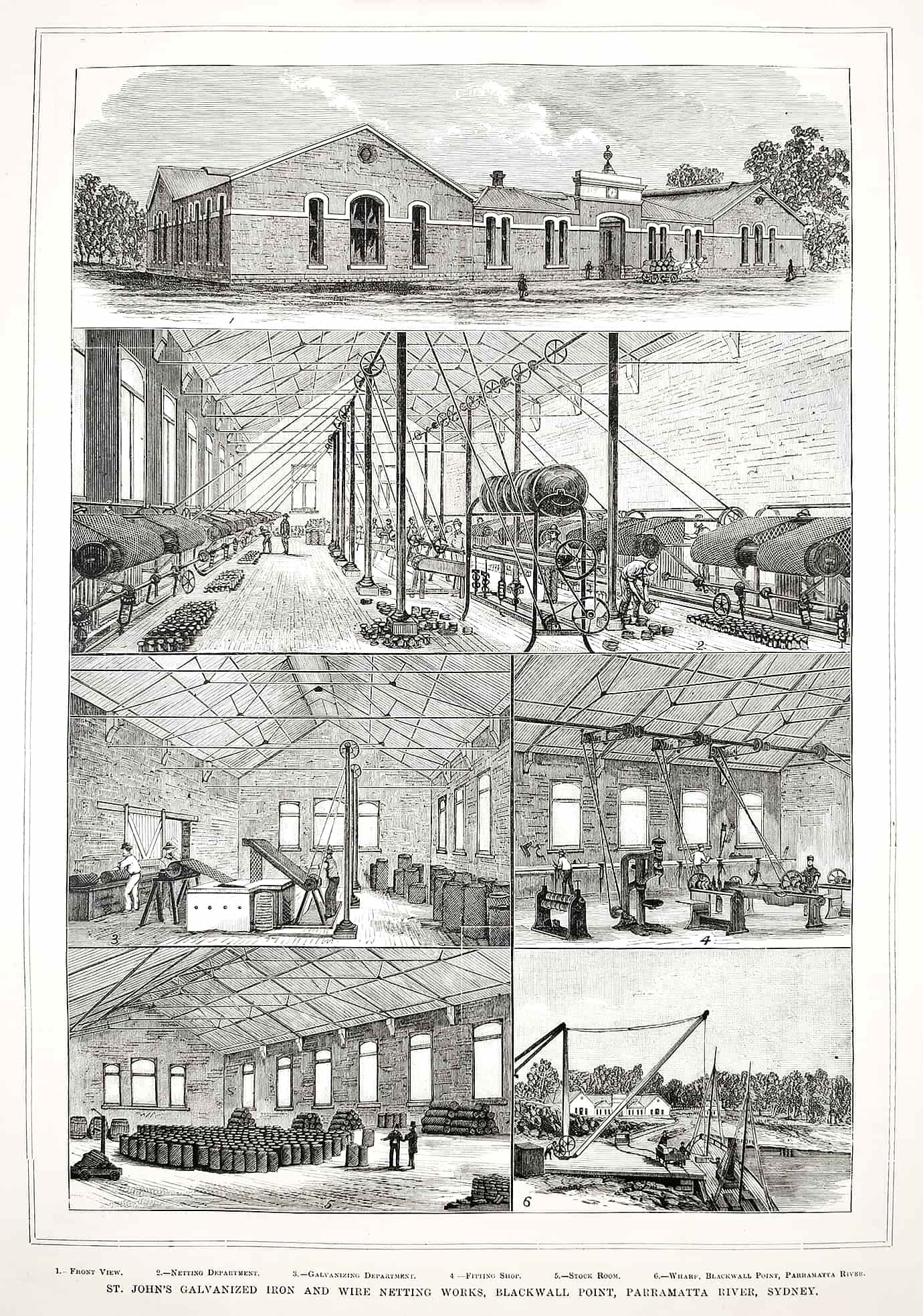 Rare detailed colonial engraving of St. John’s factory at Blackwall Point, Chiswick. 1. Front view. 2. Netting department. 3. Galvanizing department . 4. Fitting Shop. 5. Stock Room. 6. Wharf, Blackwall Point, Parramatta River. From the original edition of The … Read Full Description