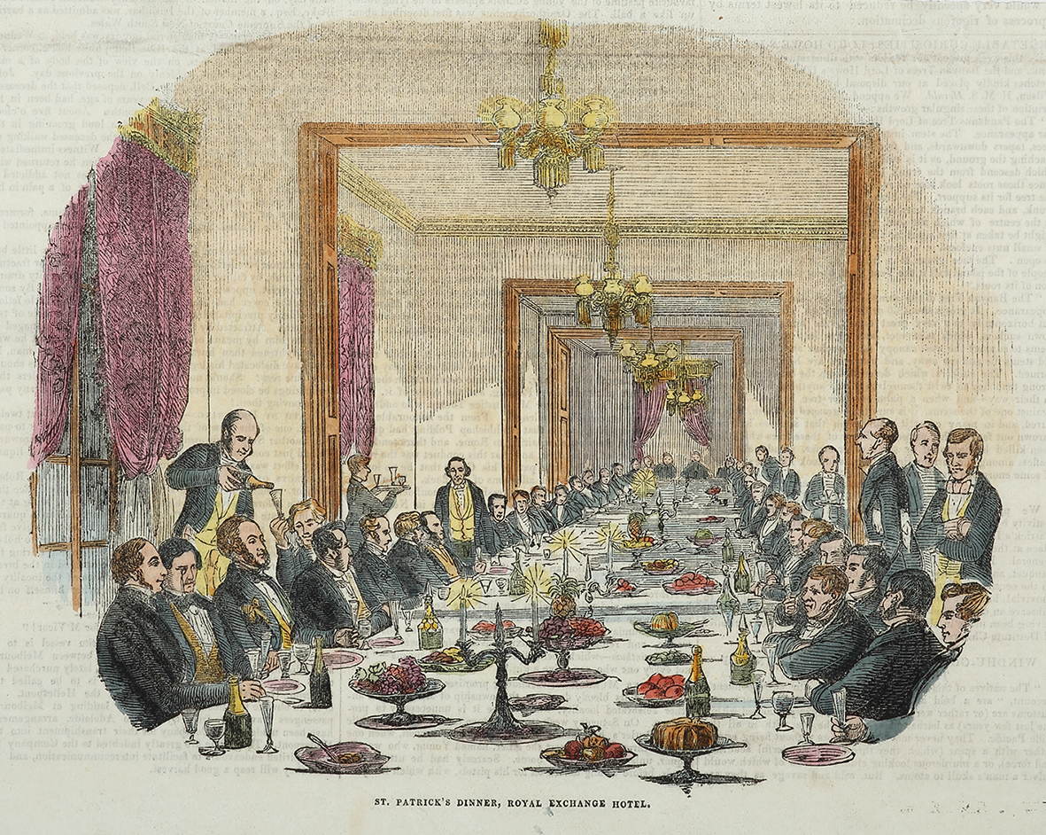 Rare c.19th engraving of THE ST. PATRICK’S DJNNER. We present our readers with an illustration of the festivity by which, on the 16th ultimo, the anniversary of St. Patrick’s Day Was commemorated in Sydney. The dinner took place at the Exchange Hotel under the presidency of the Attorney General. His Honor Mr. Justice Therry was also present at the banquet, and, as a matter of course, delivered an eloquent speech on the occasion. The proceedings of the evening were not merely convivial, but were made, at the suggestion of Mr. Plunkett, to subserve an object of charity ; a subscription of upwards of £70 having been made in the room in aid of the Asylum for the relief of Destitute Children.