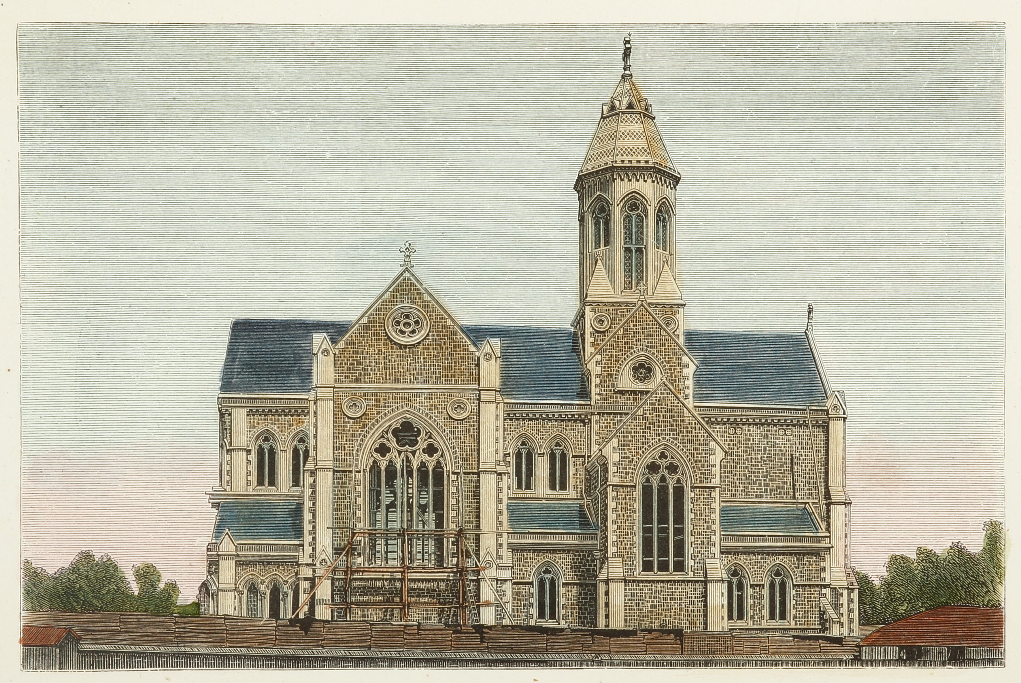 Colonial engraving of St. Peters Cathedral showing the building incomplete and without the twin towers which finally consecrated 14th July 1901.