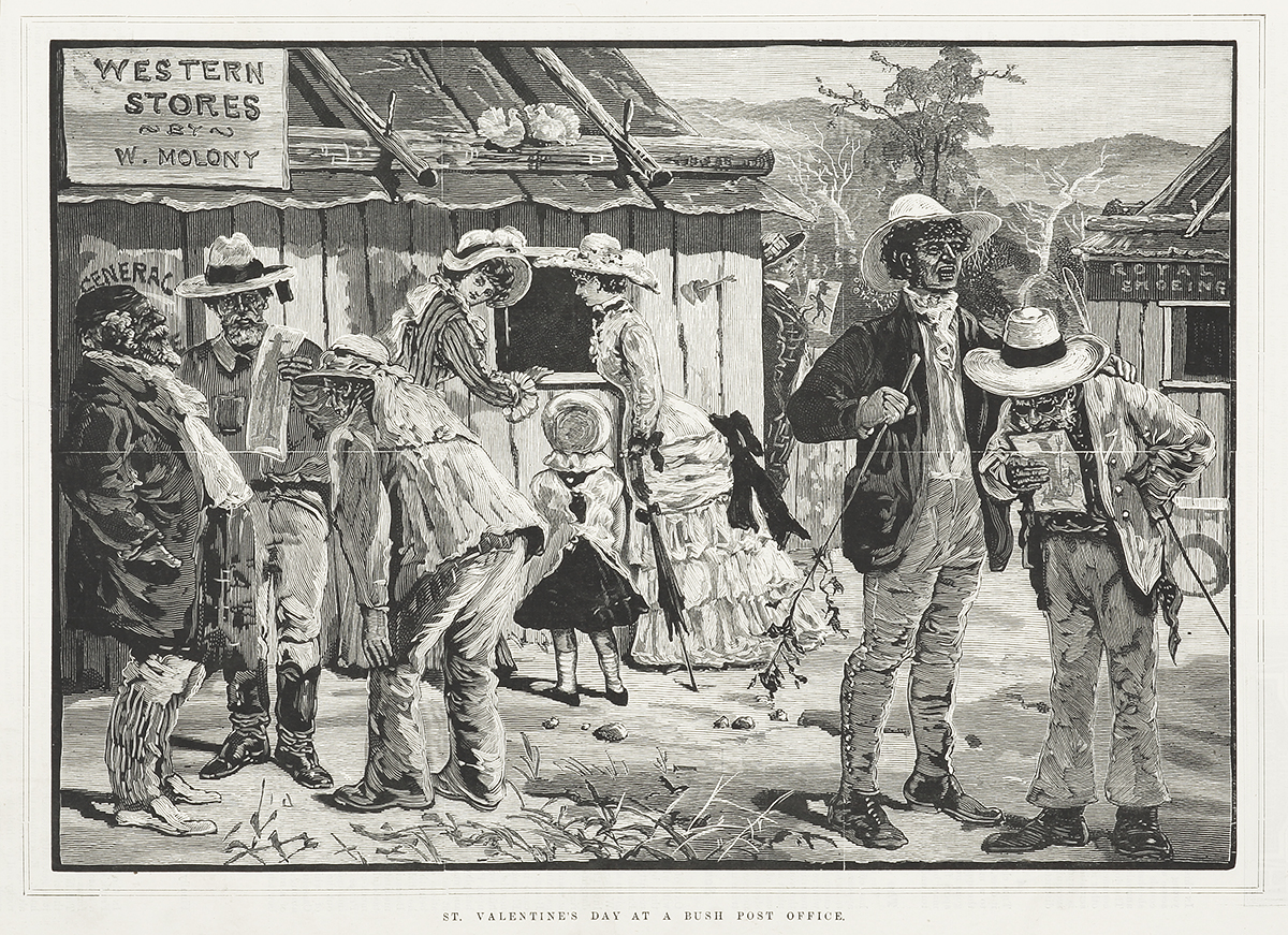 Scarce colonial engraving of people outside a bush post office on Valentine’s Day.