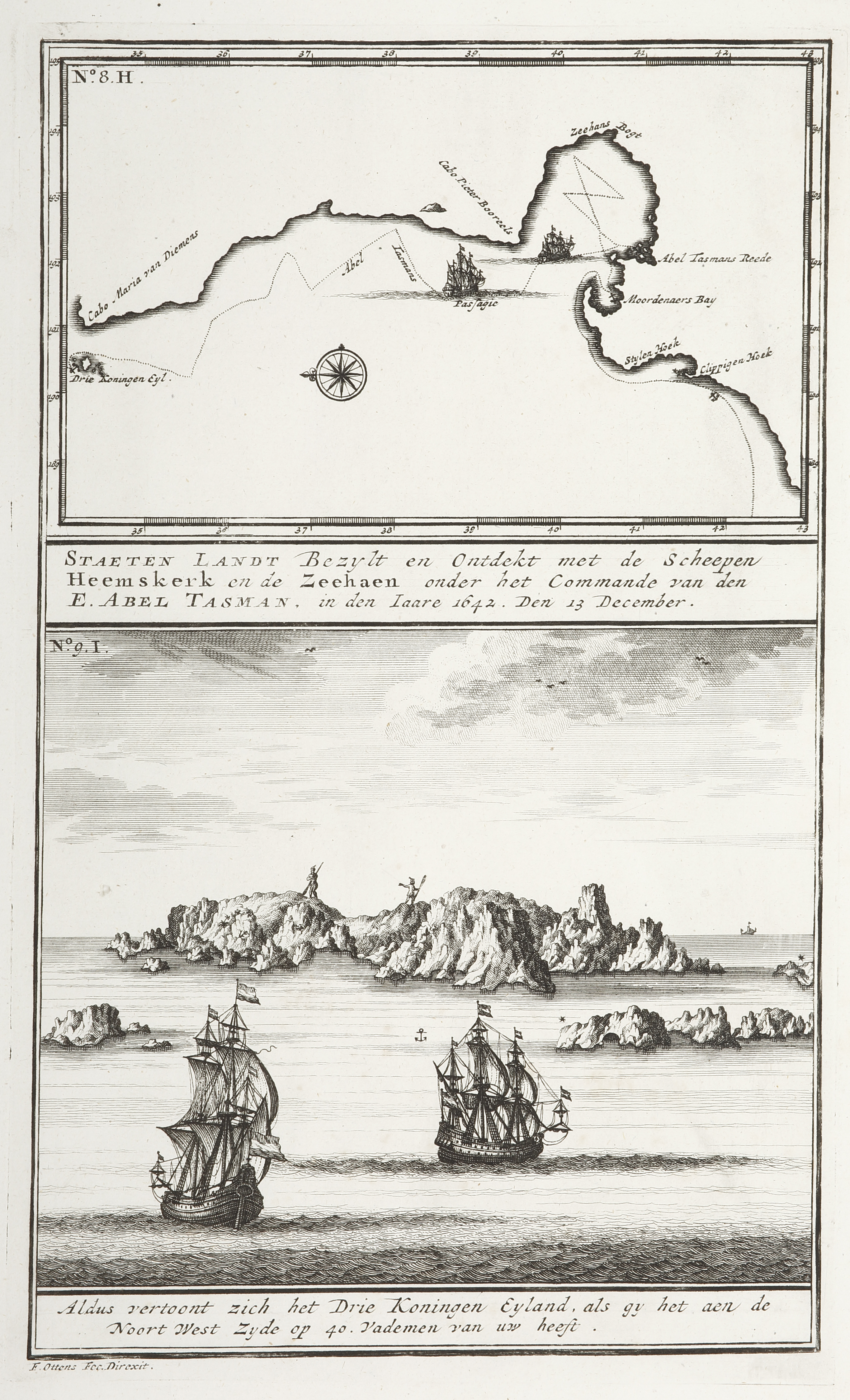 One of the first printed maps and views of New Zealand recording Abel Tasman’s visit December 1642. The map shows the tracks of Abel Tasman’s ships, Zeehaen and the Heemskerck, along the north-west coast of the South Island, the western approaches of Cook Strait and the west coast of the North Island, between 13 December 1642 to 6 January 1643.