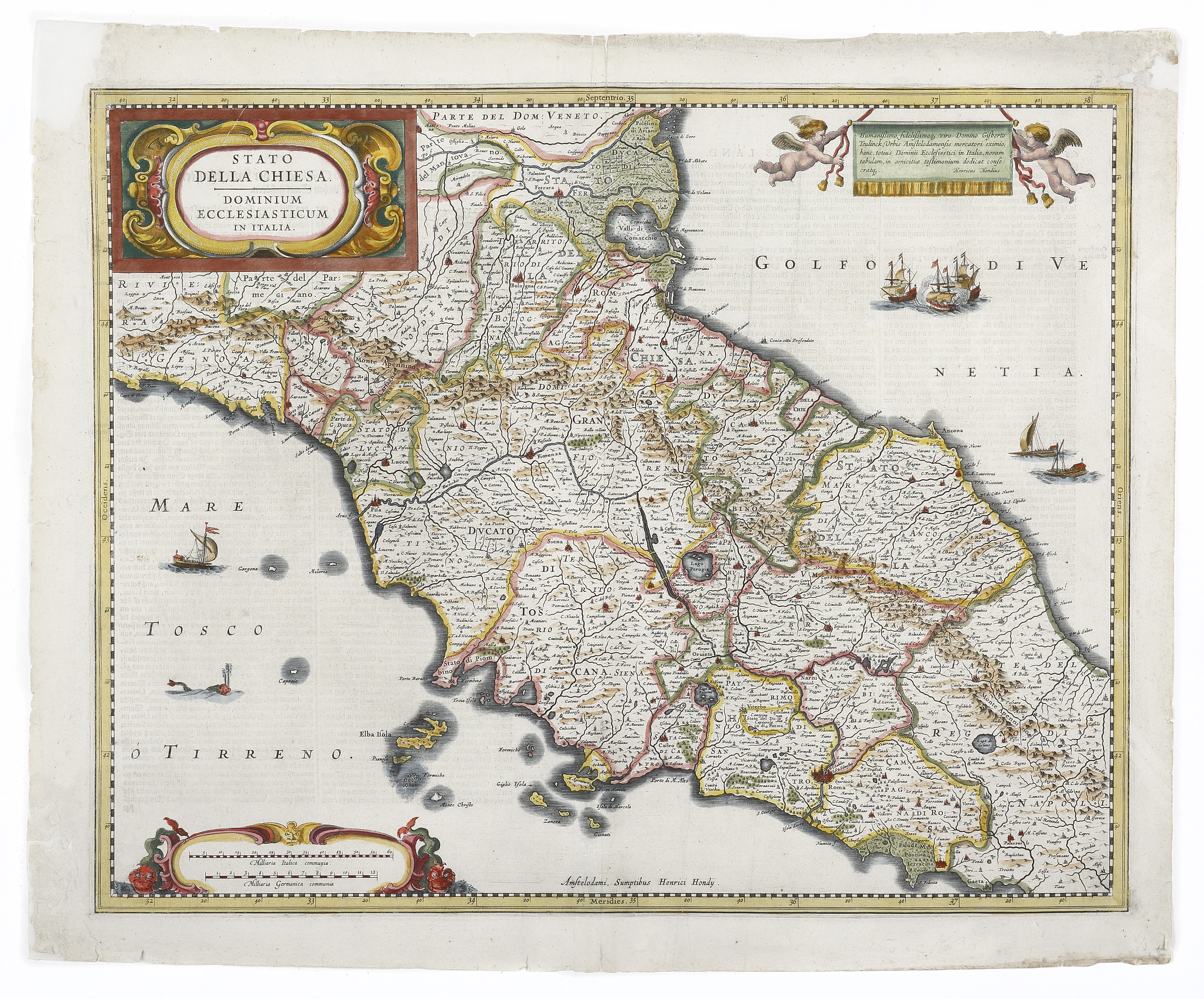 First edition of this rare c.17th hand coloured engraved map by Hendricus Hondius of the state of the Church in Italy.
