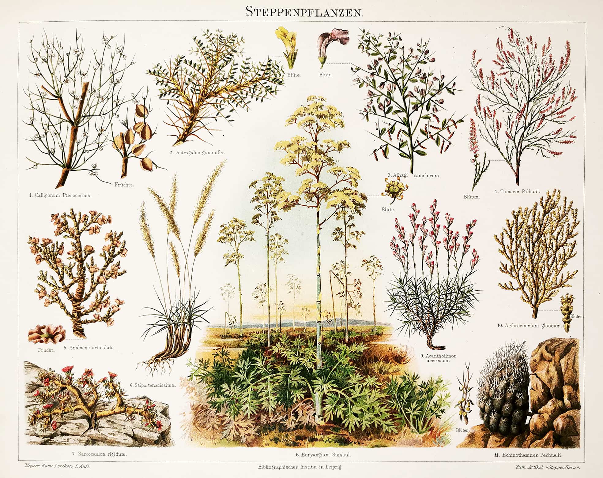 Detailed German botanical lithograph showing a variety of 11 different specimens, including the calligonum pterococcus with fruits, astragalus gummifer with blossom, camelthorn, tamarix pallasii with blossoms, anabasis articulata with fruit, esparto grass, sarcocaulon rigidum, ferula moschata with blossom, acantholimon acerosum, arthrocnemum macrostachyum with blossoms and echinothamnus pechuellii with blossoms.
