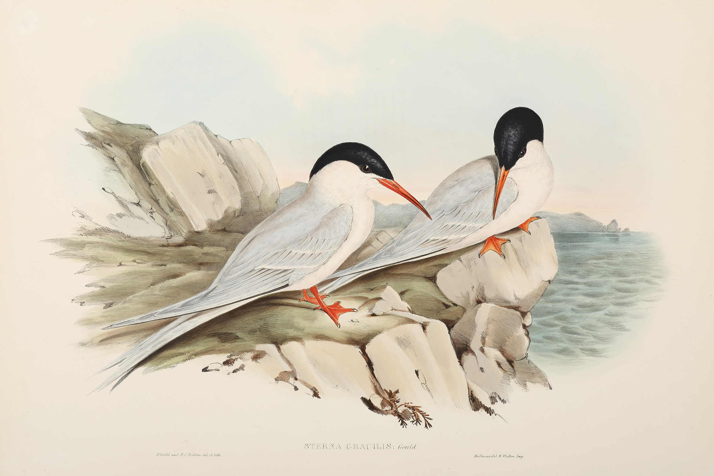 Rare lithograph of the best and largest colonial image of the Roseate tern by John Gould from his epic series, The Birds of Australia and Adjacent Islands, published for the author, printed by Richard and John E. Taylor, London.