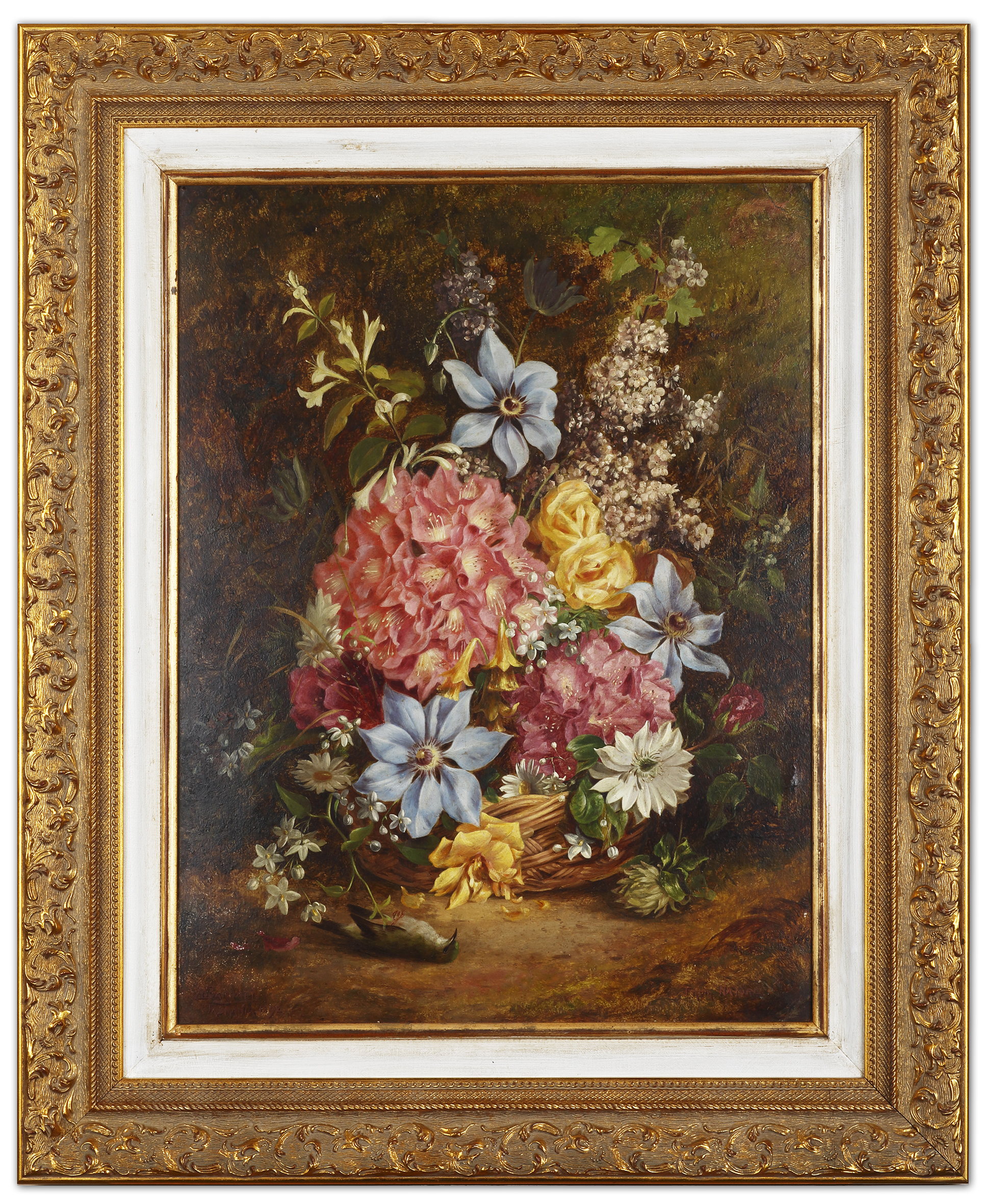 Very well executed still life oil of flowers in a basket, inscribed lower left, ‘Frank Barratt, Tasmania and From Nature’ written at lower right. The Flowers depicted include; Lilacs, Daisies, Star Jasmine, Rhododendrons, Red and Yellow Roses.