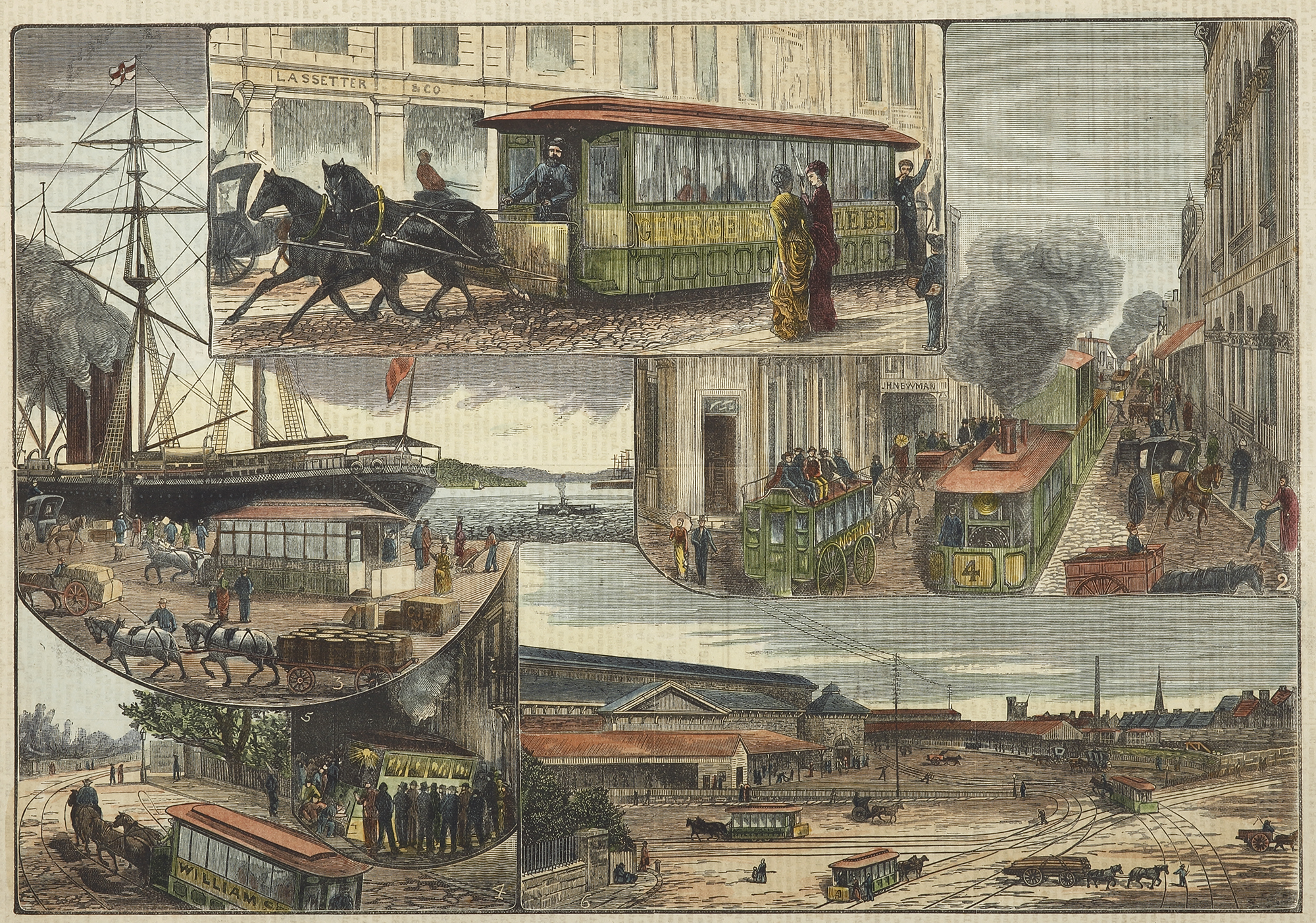Very rare engraving of proposed trams for Sydney. 1. Tramcar in Crowded Street, Stopping to Take up Passengers. 2. Our Street Railway, Dirty and Clumsy, Destroying Property and Business. 3. A System That Would Answer for Circular Quay- 4. An … Read Full Description