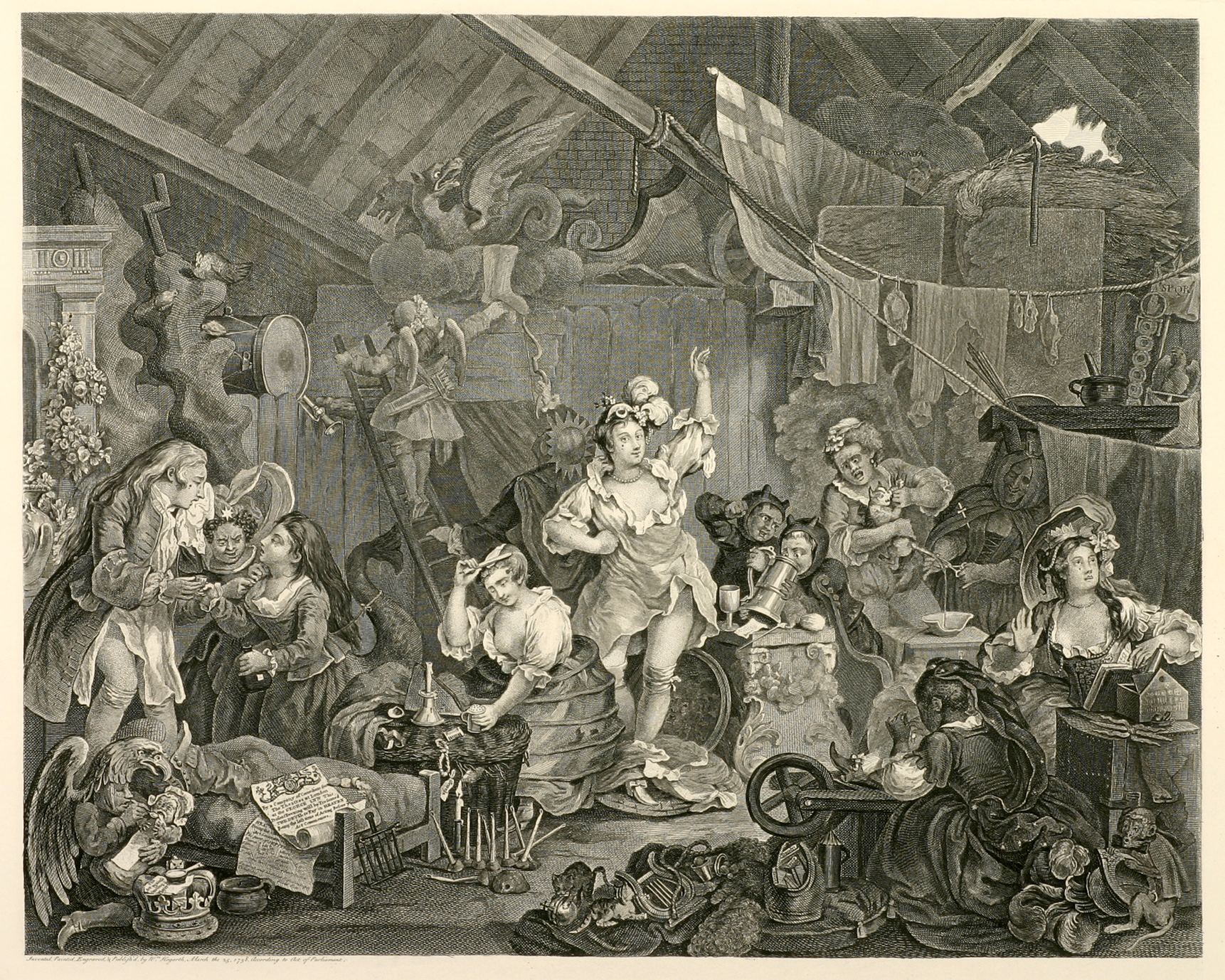 Hogarth was born in London, the son of an unsuccessful schoolmaster and writer from Westmoreland. After apprenticeship to a goldsmith, he began to produce his own engraved designs from 1710. He later took up oil painting, starting with small portrait groups called conversation pieces. He went on to create a series of paintings satirising contemporary customs, but based on earlier Italian prints, of which the first was ‘The Harlot’s Progress’ (1731), and perhaps the most famous ‘The Rake’s Progress’. His engravings were so plagiarised that he lobbied for the Copyright Act of 1735 as protection for writers and artists.