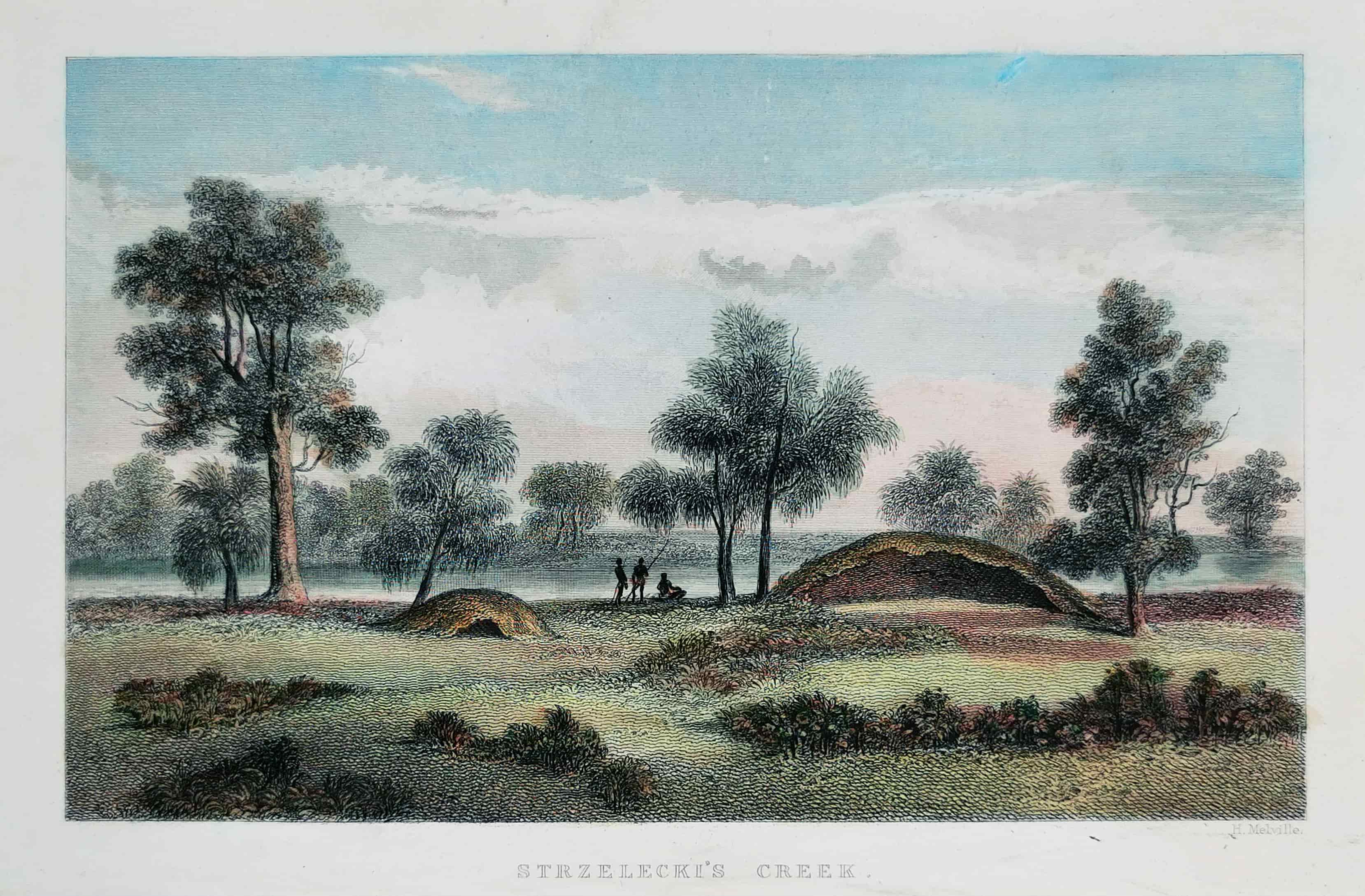 Rare engraving of Strzelecki Creek from Charles Sturt’s account of his expedition. Charles Sturt, 1844-46, sought to solve the mystery of the character of inland Australia and on his expedition penetrated further into the interior than any previous explorer. His party of sixteen avoided the ‘horseshoe lake’ by travelling first to Menindee on the River Darling in New South Wales. Then striking northwest, they discovered the Barrier Ranges and re-entered South Australia on a side trip which brought them in sight of Mount Hopeless in the Northern Flinders Ranges. Returning to New South Wales and discovering the Grey Range, Sturt again struck northwest across the stony desert that bears his name, and crossed the channels of Strzelecki Creek, Cooper Creek, Diamantina River and Eyre Creek before turning back from what is now known as the Simpson Desert.