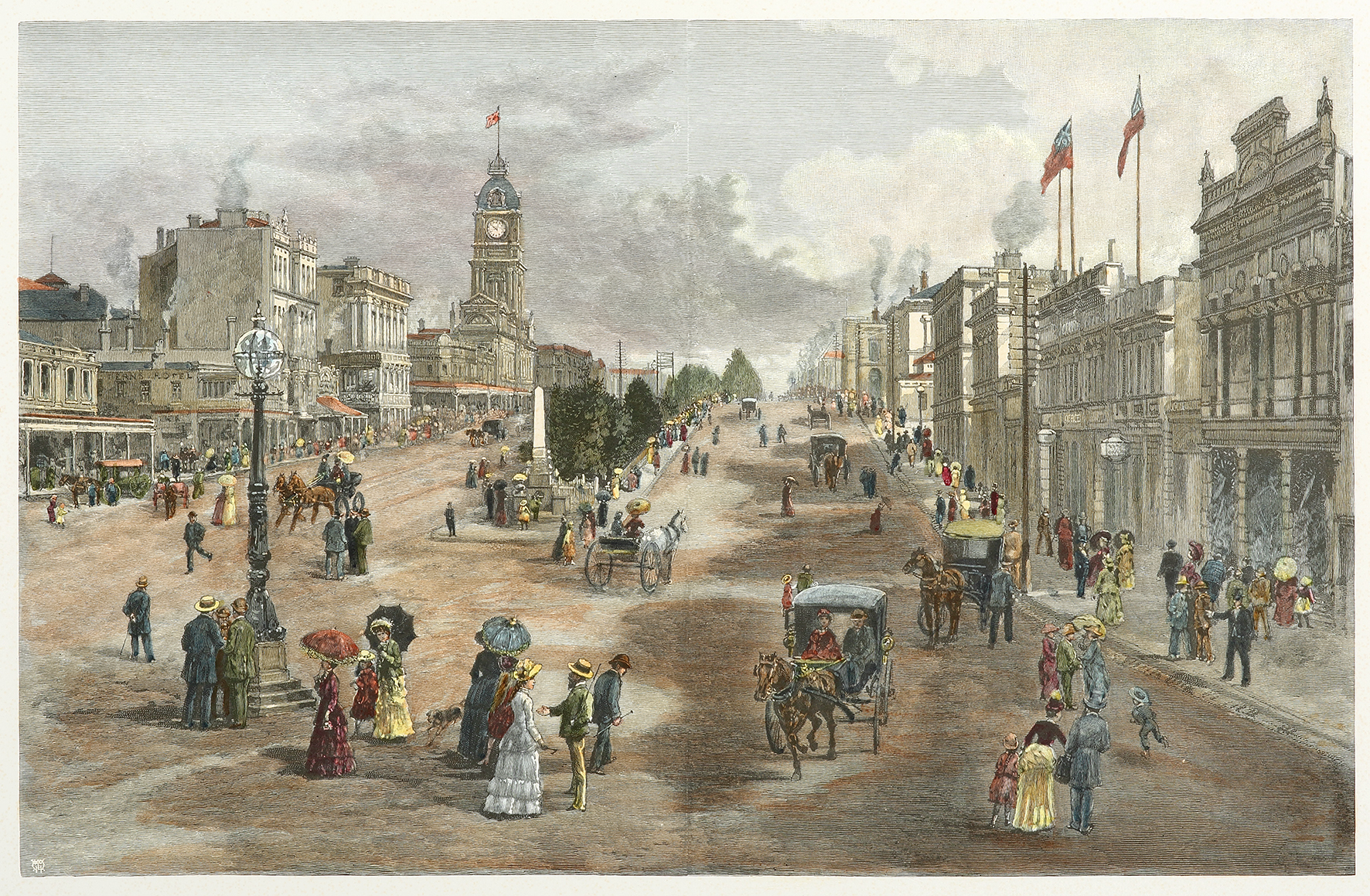Wonderful colonial engraving of Sturt Street, Ballarat showing the prosperity that the gold discoveries had on the town. Beginning as a gold mining town in 1851, Ballarat became the largest inland city in Victoria, with a population of 20,000 by the following year.