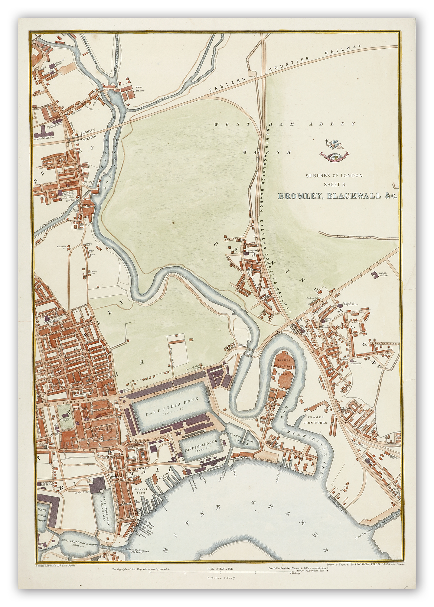 Very detailed map of the London suburbs of Bromley and Blackwall by Edward Weller.