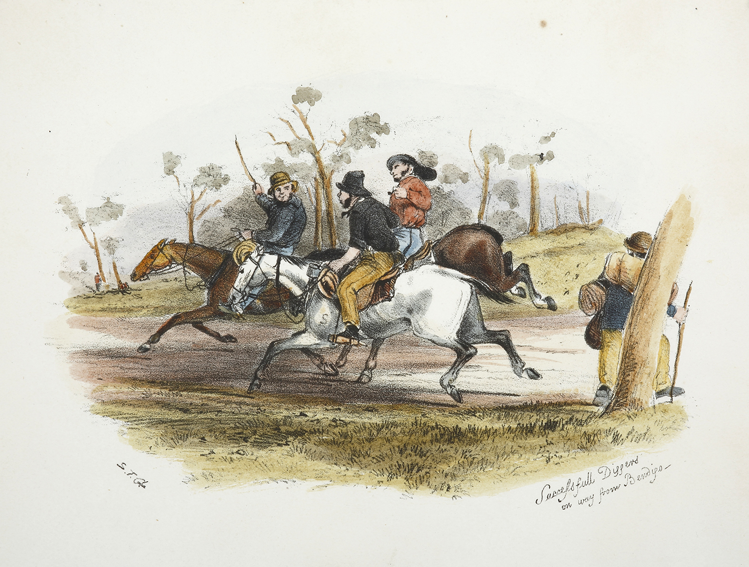 Samuel Thomas Gill (1818-1880) S.T. Gill as he is often now known, was born at Somerset, England, the son of Rev. Samuel Gill, Baptist minister, and educated at Plymouth in a school kept by his parents, and later at Dr Seabrook's academy. His father taught him drawing and he was later employed in London as 'Draftsman and Water Colour Painter' by the Hubard Profile Gallery, an establishment which produced silhouettes. He arrived in South Australia in 1839 and by March 1840 had established a studio in Gawler Place, Adelaide, which was open from 'eleven till dusk'; he offered to produce portraits of human beings, horses and dogs, and to sketch houses and transfer the sketches 'to paper suited for home conveyance'. In 1846 he accompanied the Horrock's expedition which reached the head of Spencer Gulf. In 1852 Gill travelled to the Victoria and in the next twenty years produced drawings, watercolours and lithographs of scenes of the Victorian and New South Wales gold fields. After 1870 Gill fell into obscurity and on 27 October 1880 he collapsed in Post Office Place, Melbourne, and was found to be dead when taken to hospital. Gill's legacy is a large body of work which portrayed life during the greatest gold boom the world had ever seen.