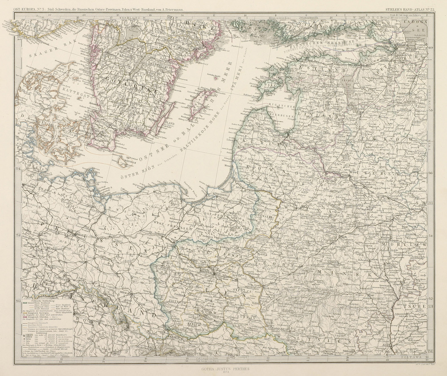 Detailed C19th German map of northern Europe, showing Germany, Poland, and countries north along the Baltic Sea and westwards to Denmark and Sweden.