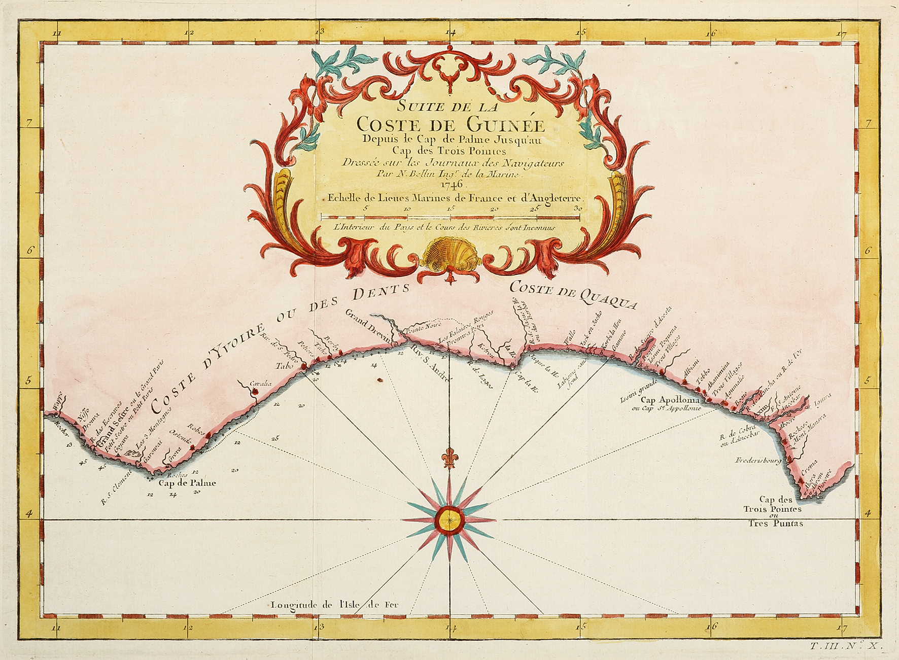 Decorative map of the coast of Guinea from, Cape Apollonia to the Volta Rive by Nicholas Bellin (1703-1773)