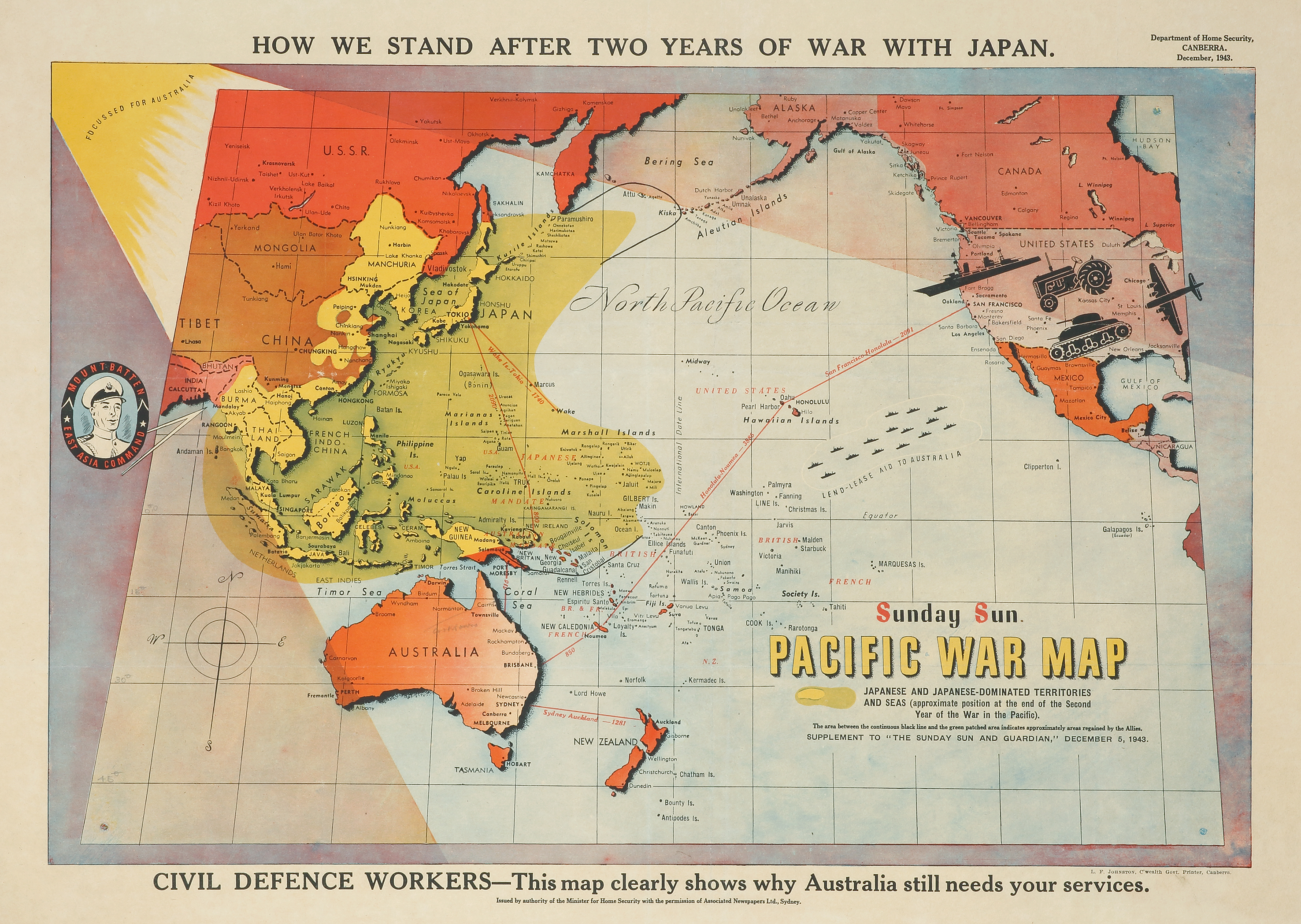 Scarce map of Japanese and Japanese-Dominated Territories and Seas (approximate position at the end of the Second Year of the War in the Pacific). A portrait of Earl Louis Mountbatten, the Supreme Allied Commander of the South-East Asia Theatre, is at the left of the map.