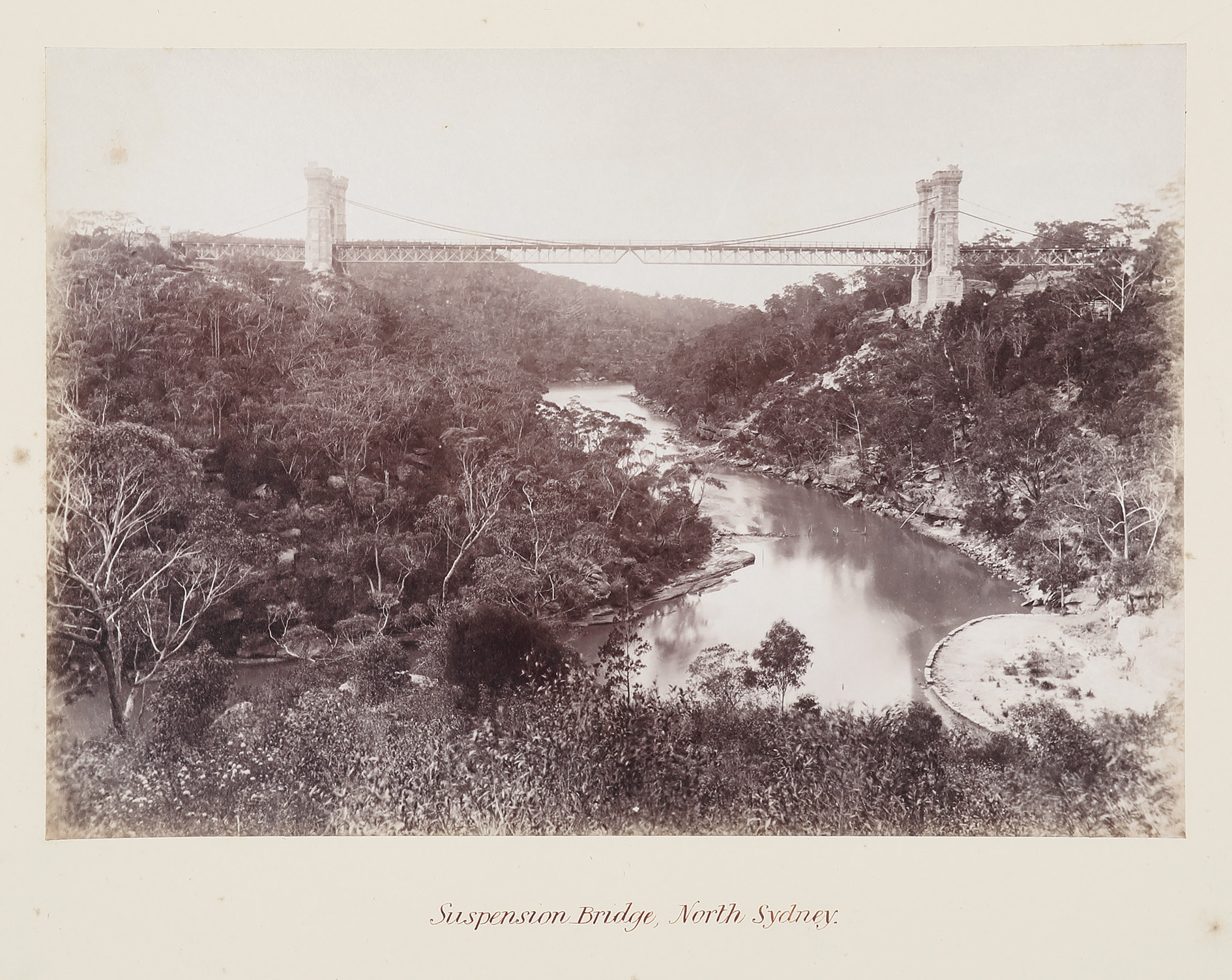 Rare early c.20th albumen photograph of the North Sydney Suspension bridge built to encourage residential development at Northbridge and Cammeray. The bridge built between 1889 and 1892, it was designed by Professor William H Warren of the University of Sydney … Read Full Description