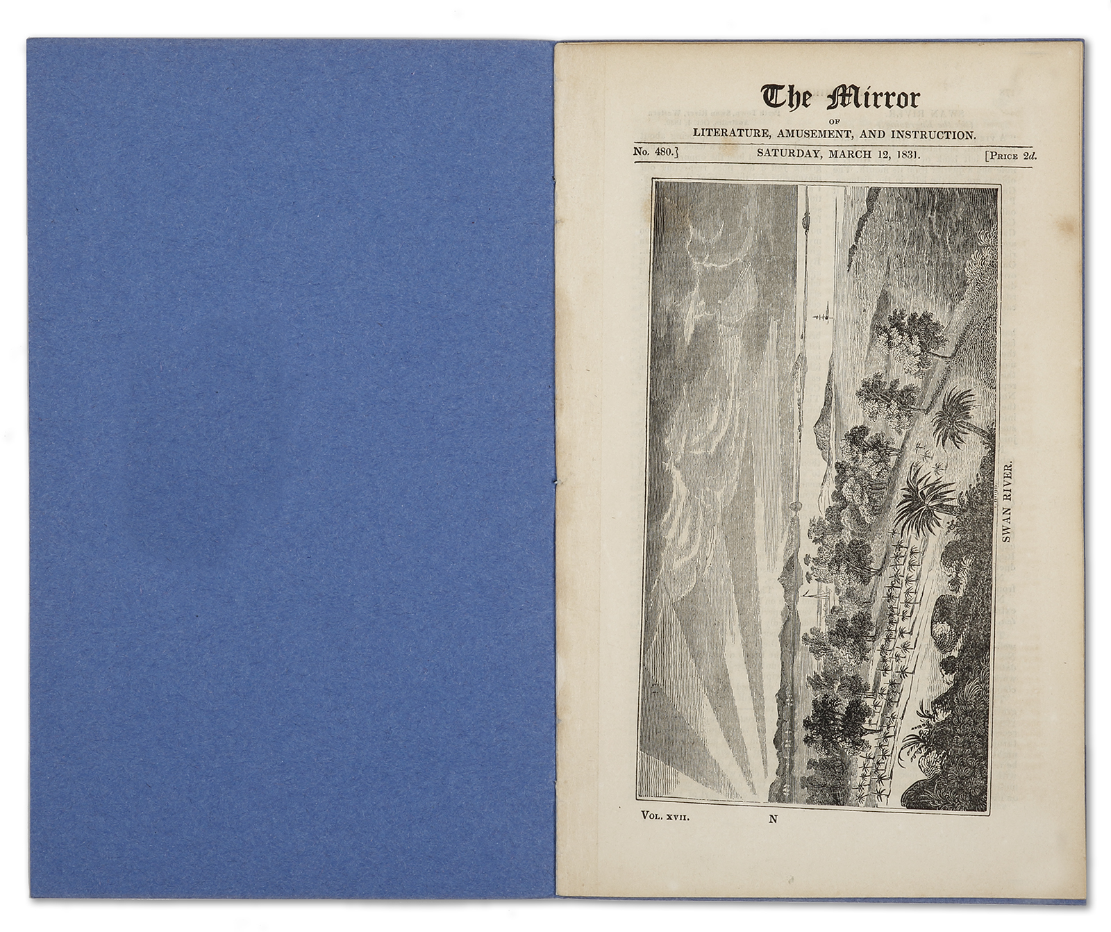 Printed London: J. Limbird, single issue bound with blue paper wrappers with printed title label, No. 480 Saturday, March 12, 1831. Two and half pages of text and a full page engraving titled; Swan River. The text is a letter from a anonymous settler at Swan River Colony who provides a detailed account of every aspect of the new settlement and describes the trials and tribulations encountered.