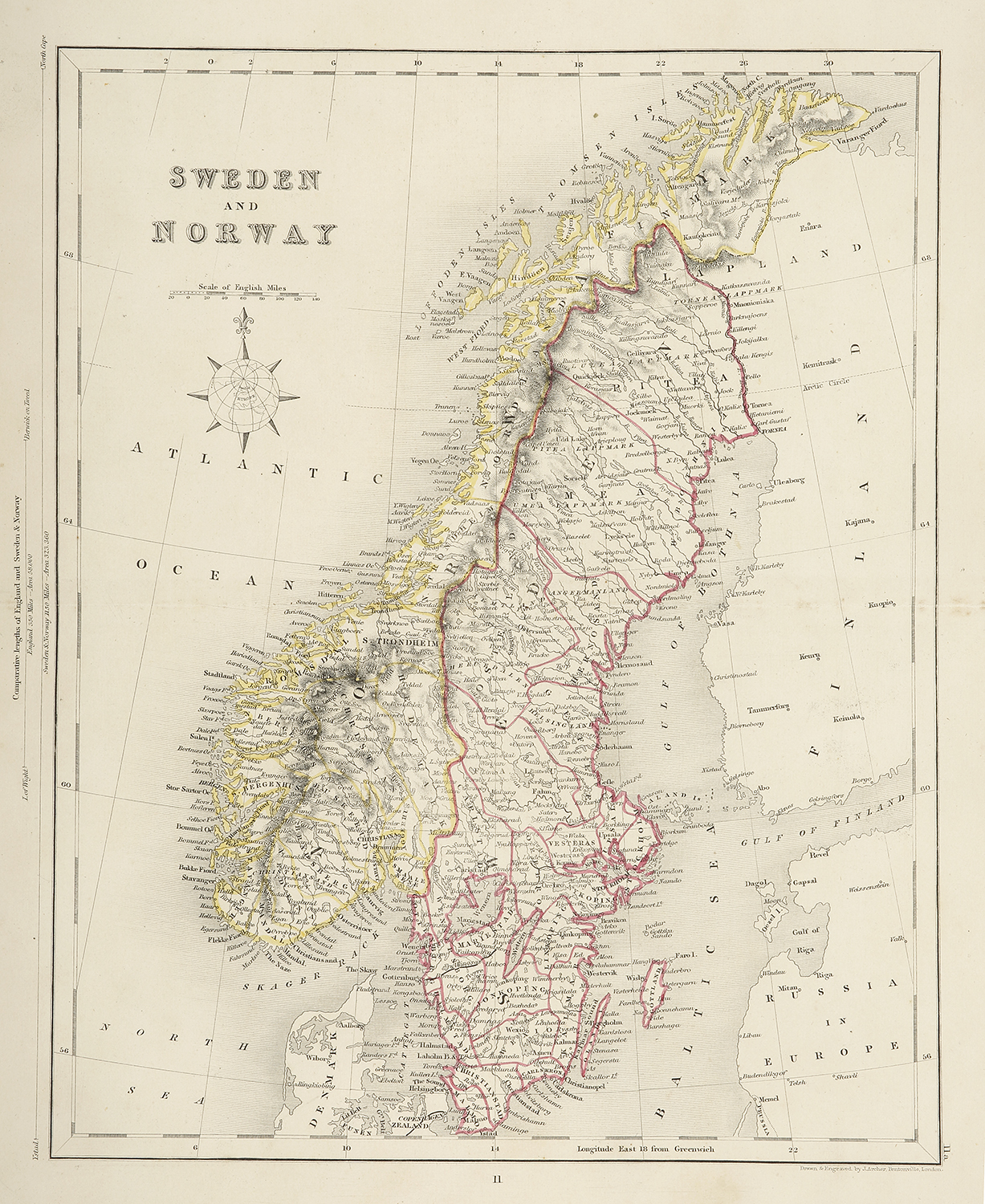 Detailed c.19th engraved map of Sweden and Norway by Joshua Archer (1792-1863).