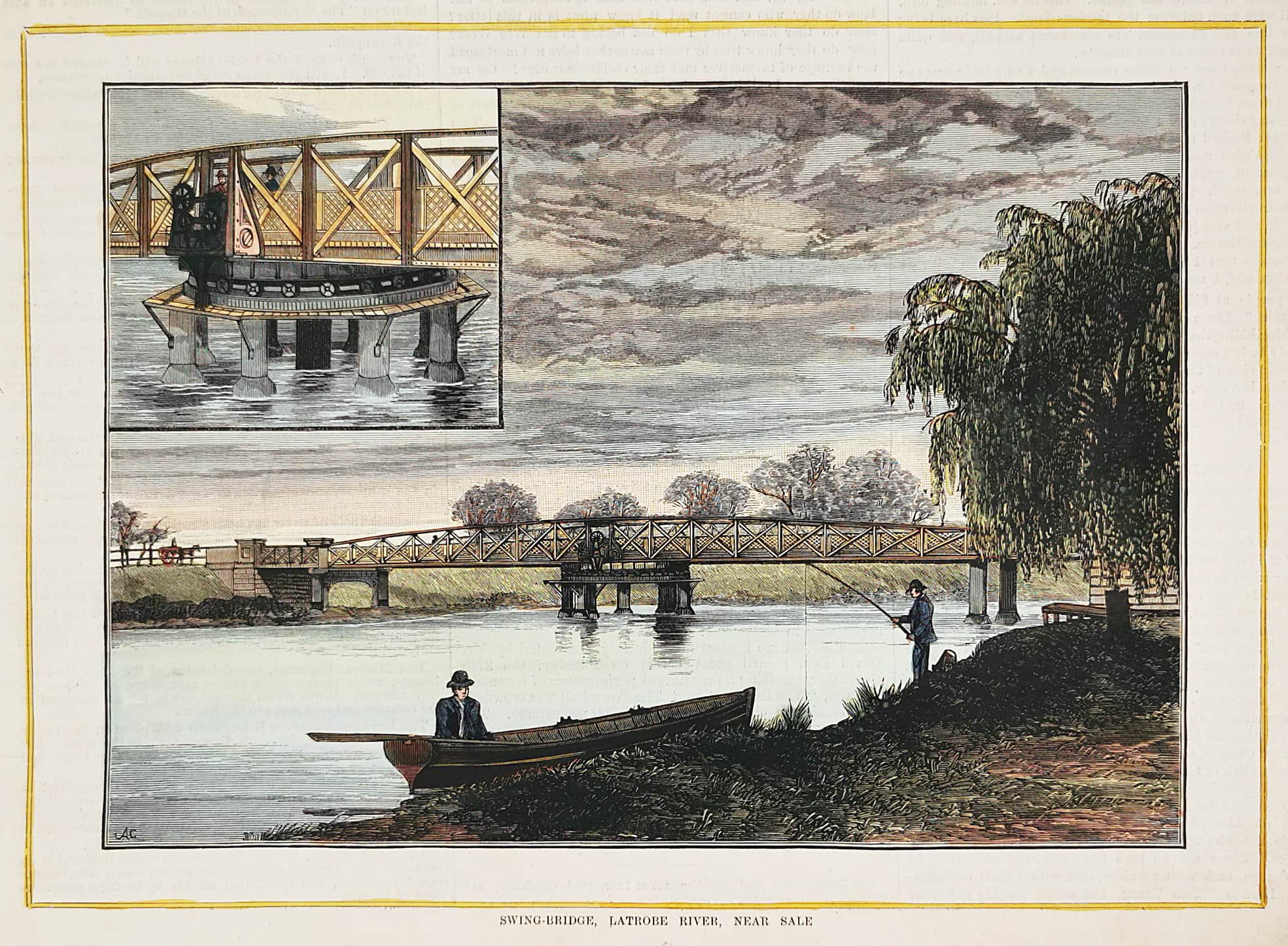 Colonial engraving of the Sale swing bridge designed by John Grainger and built in 1883. It was the first movable bridge built in Victoria, it is 45 metres long, and swings on cylindrical steel columns.