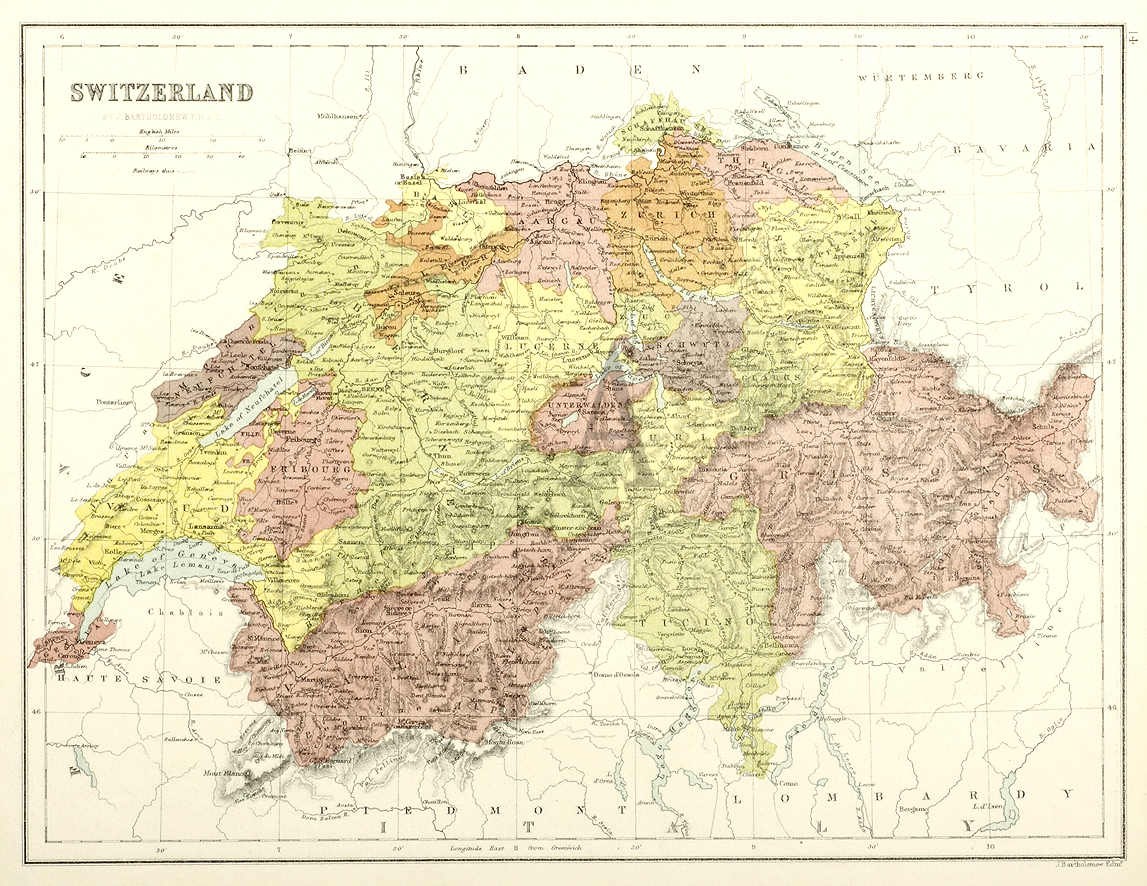 Detailed C19th map of Switzerland.