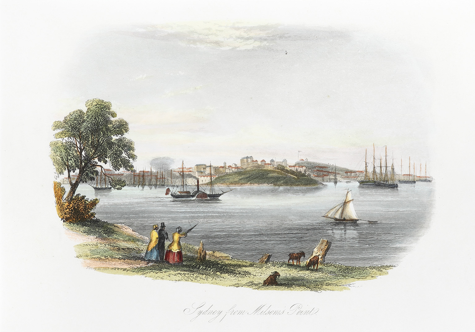 Artist and engraver born England and emigrated to Sydney and arriving in Sydney in the early 1850's. He was soon part of colonial society and became known for his paintings and engravings. This engraving is from his rare series Landscape Scenery Illustrating Sydney and Port Jackson, New South Wales printed by Sands and Kenny. Unusually set within an oval image they included views of Sydney town and the harbour, as well a number of country towns. Unfortunately the engraver had mispelt Terry's name and as a result it appears as Fleury. At the 1855 Paris Exhibition he was included with five other Australian artists in having his paintings displayed. He was then invited to exhibit in the Further Exhibition of the Society for the Promotion of the Fine Arts in Australia held in the Mechanic's School of Arts. By the 1860's he was established as one of best colonial artists and in 1861 he had been made examiner at the Mechanics School of Arts. Terry died at the early age of forty four and as many artists before him he had struggled financially in his last years.