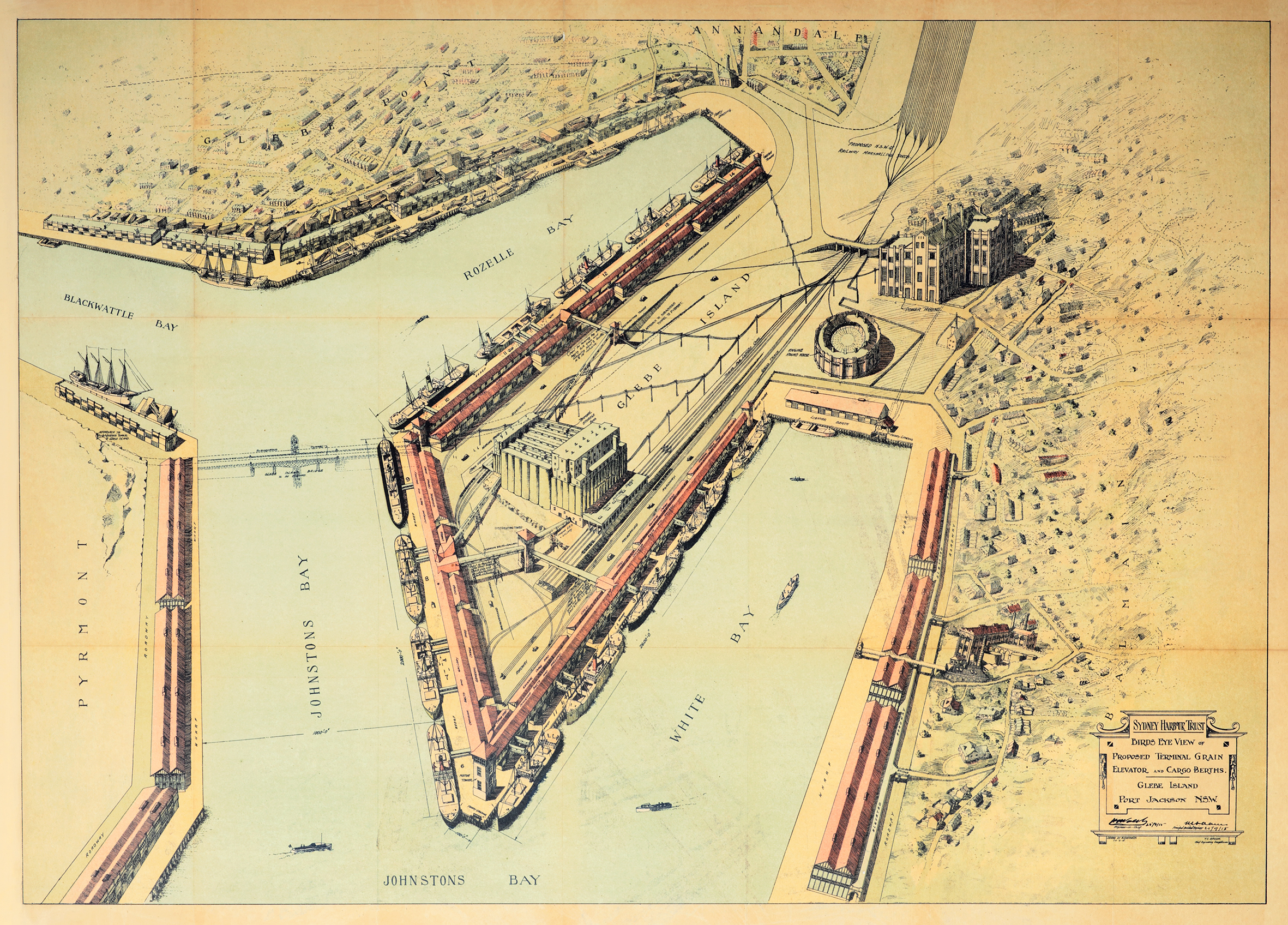 Large c.20th colour lithographic view of Glebe Island wharves by William Henry Withers ( 1882 – 1947) commissioned by the Sydney Harbour Trust Commissioners as part of their survey of the port facilities in Sydney Harbour. All the wharves, roads, railways, depths, shipping channels are marked, as well as all the bays which are named and identified.