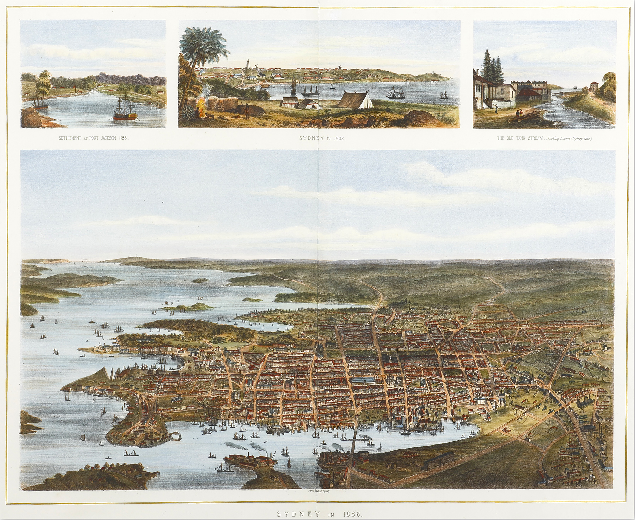 Superb c.19th hand coloured lithographed panorama of Sydney, with three inset historical views at top illustrating Sydney’s development since 1788.