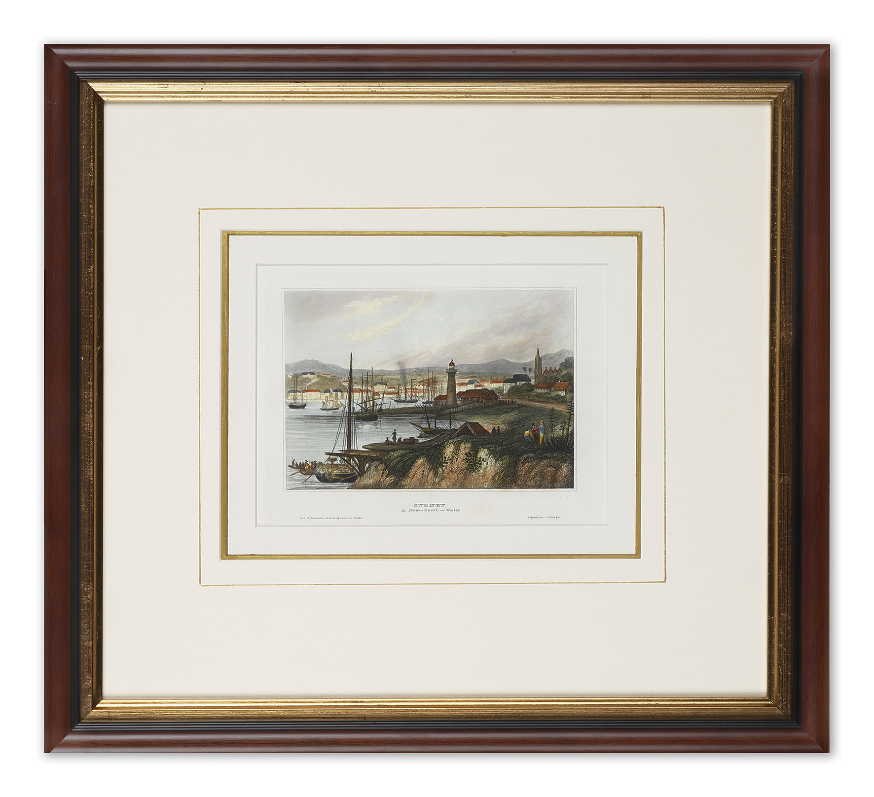 Interesting early view of Sydney based on the famous E.Dayes aquatint originally issued in 1804. The church on the right is the original Phillips church on Church Hill.