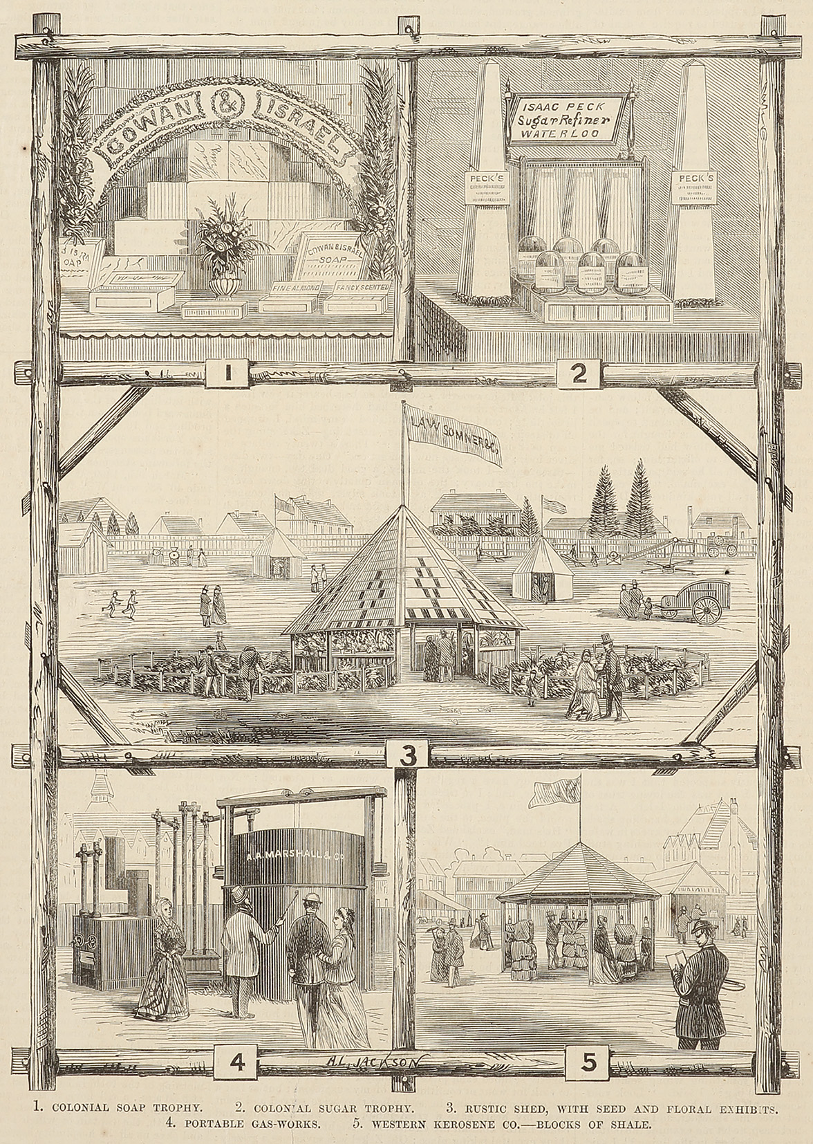 Rare c.19th engraving of exhibitors at the 1869 Sydney Intercolonial Exhibition held at Alfred Park, Surrey Hills.