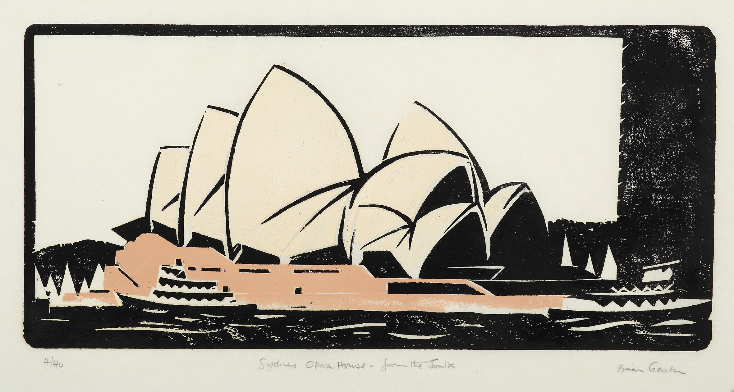 Wonderful linocut by the Sydney artist (William) Brian Gaston of the Opera House, from the south, numbered 4 of an edition of 40, signed in pencil lower right.