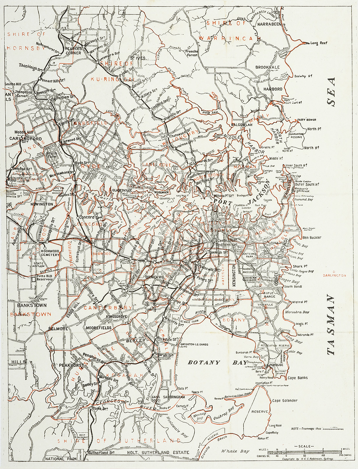 Detailed early c.20th untitled map of Sydney extending from Narrabeen to Sutherland and west to Newington.