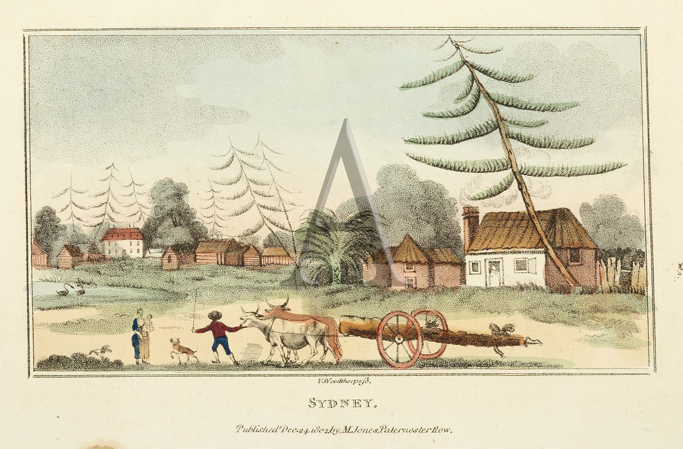 Early view of Sydney taken from the northern end of George Street, with Sydney Cove (Circular Quay) at the left edge of the print. A bullock wagon is pulling a felled tree in front of a group of wattle and daub huts.