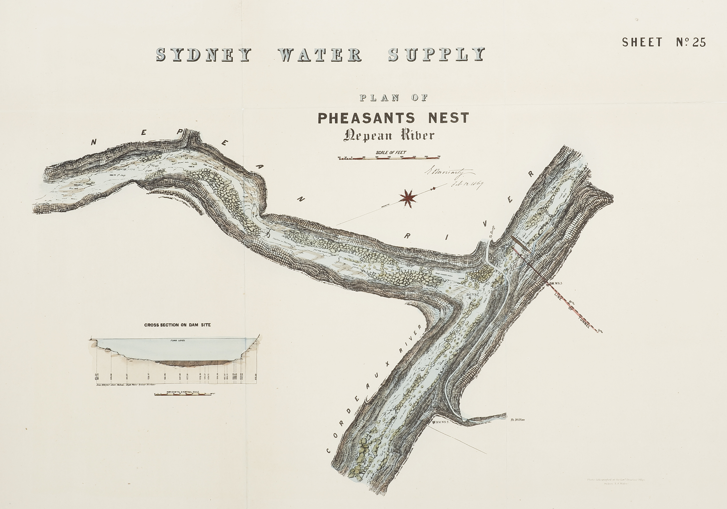 Rare c.19th map showing Pheasants Nest, Nepean River, a section of the proposed improvements for Sydney’s water storage. Collections: National Library Australia: Bib ID 2453565 State Library NSW: Reference code (AuSN)b38398989-61slnsw_inst History of Sydney’s water supply; Following Governor Phillip’s discovery of … Read Full Description