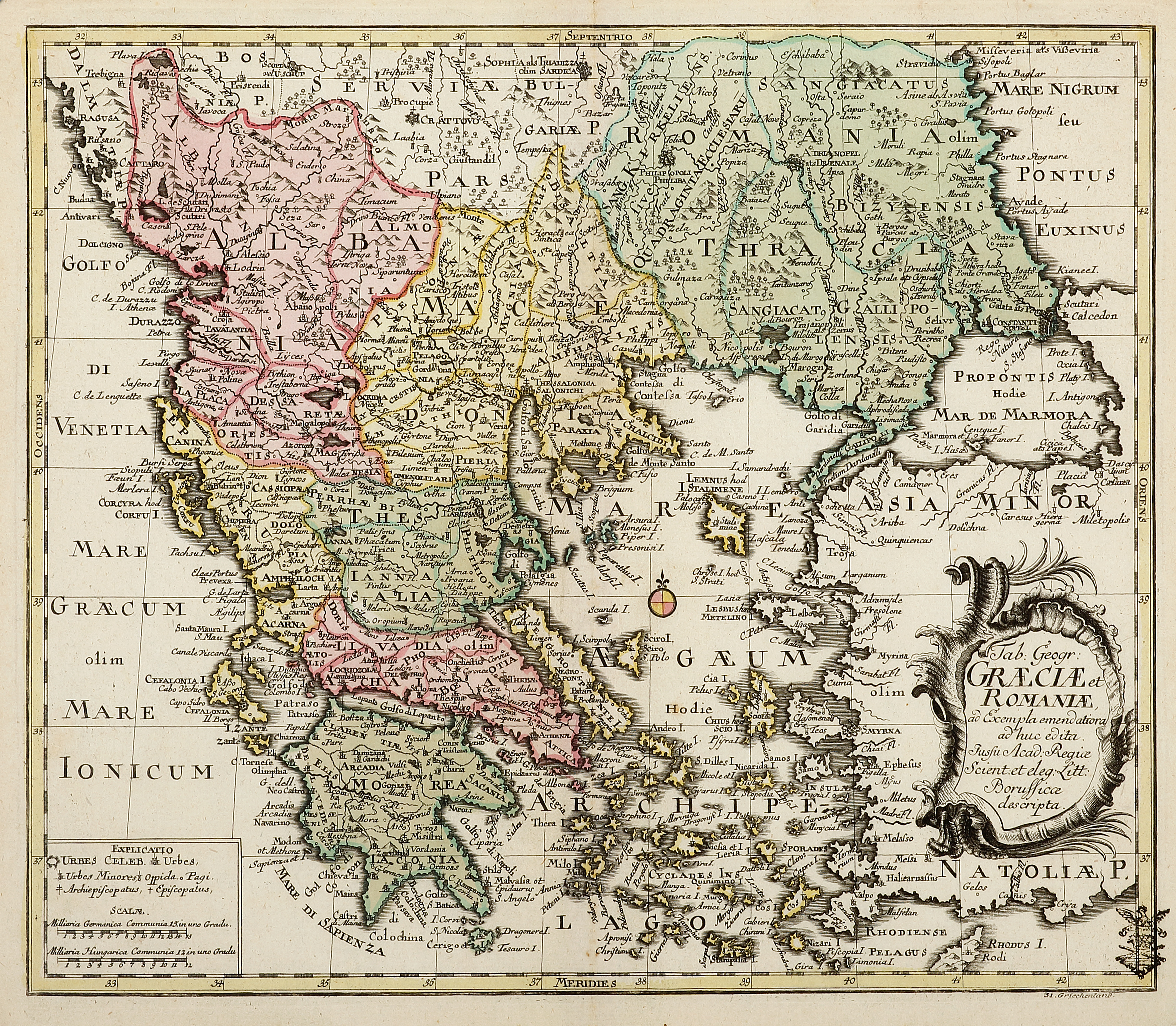Rare c.18th map of Greece by Leonhard Euler with an elaborate Rococo styled title cartouche on the right. From, Euler’s, Atlas geographicus omnes orbis terrarum regiones…