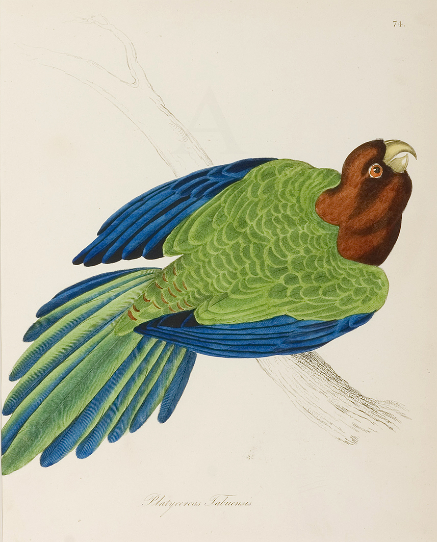 Common names: King Parrot, Southern King Parrot, King Lory Modern binomial name: Alisterus scapularis First described: Lichtenstein, 1816. Distribution: VIC NSW, QLD From: Jardine, W. and Prideaux Selby. J. Illustrations of Ornithology. Edinburgh