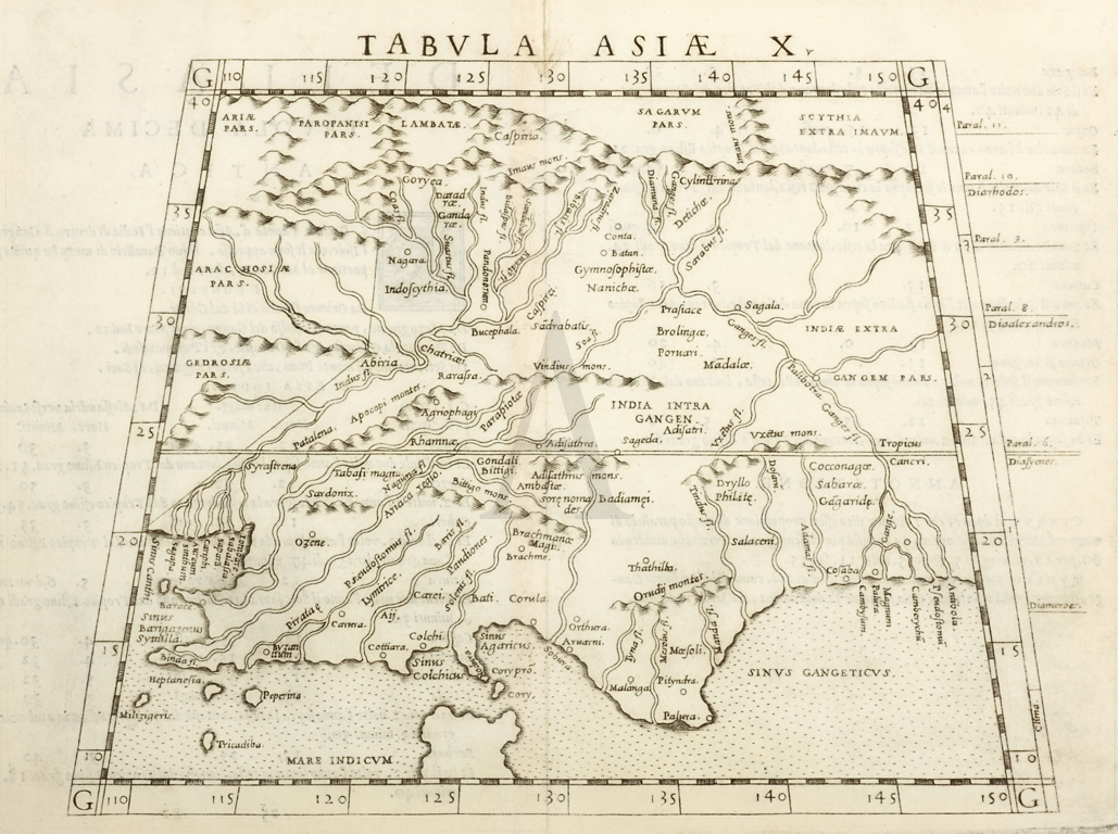 Map of India conforming with Ptolemy’s concept of a land locked Indian Ocean. Rare Ref: Stevens