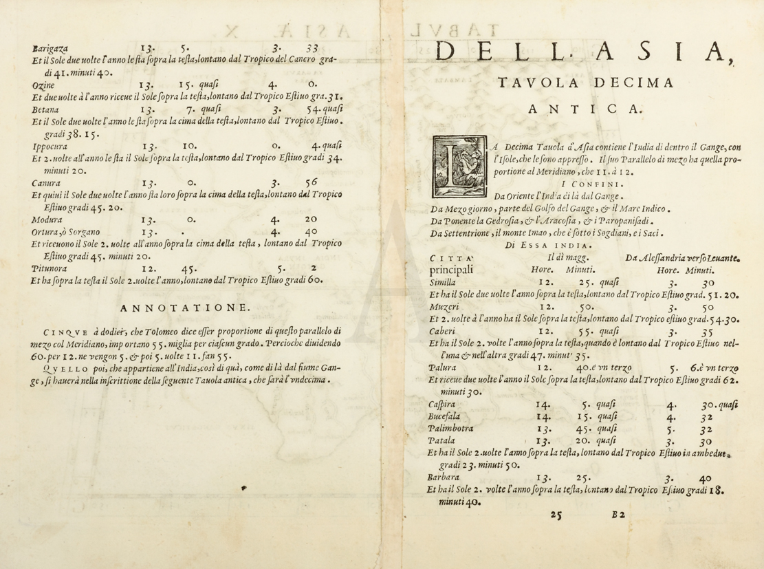 Girolamo Ruscelli was a prominent c.16th Italian polymath, mathematician, cartographer, and alchemist. Born in Viterbo and lived in various cities during his life including; Aquilea, Padua, Rome, Naples, and finally settled in Venice until his death.He wrote on a wide range of subjects and often worked on behalf of third parties, including a partnership with publisher Plinio Pietrasanta until 1555 when he was tried by the Inquisition for the unlicensed publication of a satirical poem. Most of his later works were published by Vincenzo Valgrisi. He wrote an immensely popular book on alchemy under the pseudonym Alessio Piemontese, published in 1555. The book, De Secreti Del Alessio Piemontese, included recipes for alchemical compounds, cosmetics, dyes, and medicines and was translated into numerous languages. Ruscelli's translations of various classics, including the Decameron and Orlando Furioso, were also popular. His translation of Ptolemy's, Geografia included 69 maps, 40 of which were contemporary and based on maps compiled by Giacomo Gastaldi in 1548. Ruscelli also compiled a Rimario (rhyming dictionary) that remained in use until the 19th century.