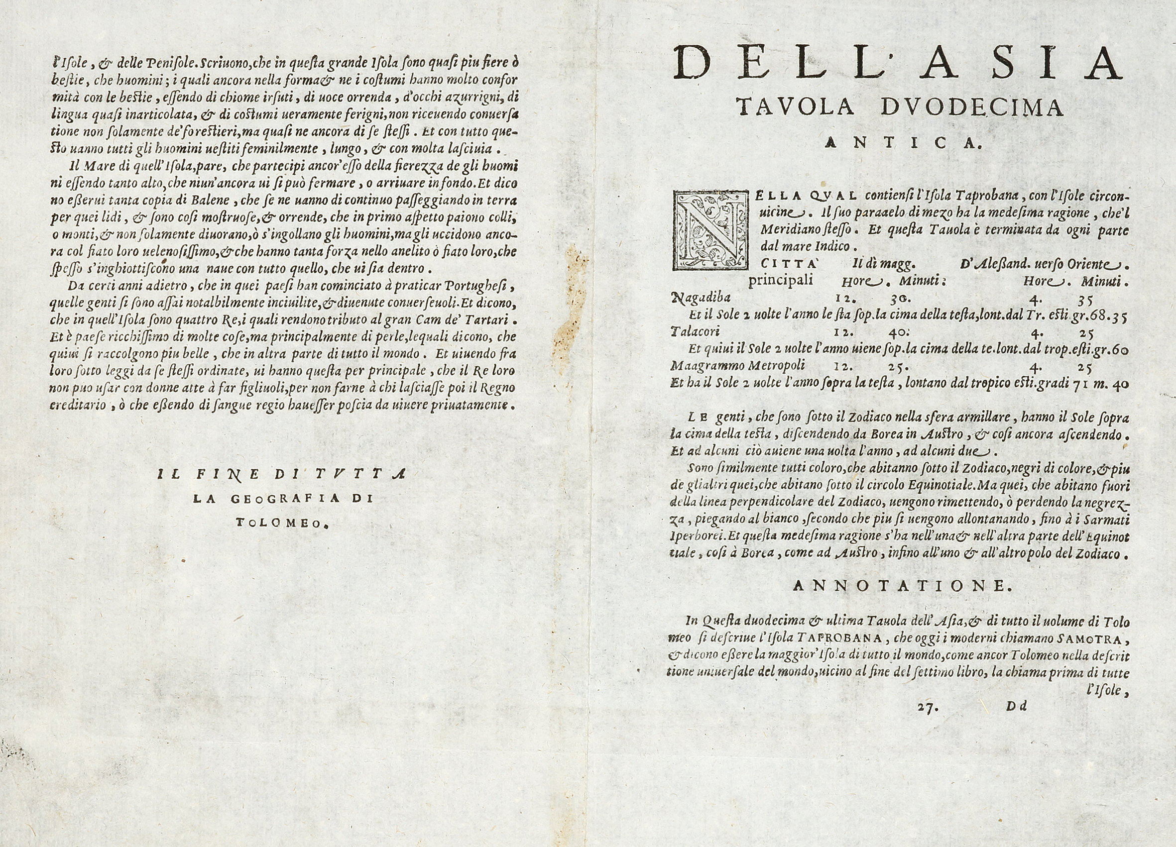 In the lower left is a decorative cartouche which includes a note indicating that the island was a rich source of ivory. In ancient times, Sri Lanka was known by various names, Ptolemy named it Taprobana, the Arabs Serendib, the Portuguese called it Ceilo and the British, Ceylon. Much confusion existed among medieval mapmakers as to the identities of the islands of Taprobana and Sumatra which arose primarily from the descriptions in the ancient texts which stated that Taprobana was the largest island in the world. This was later contradicted by Marco Polo in his Il Milione in which he stated that it was Java Minor (Sumatra) that was in fact the largest island. As Sumatra was virtually unknown to most medieval mapmakers their primary concern was the placement of Taprobana on maps. Invariably it was incorrectly positioned off the southeast coast of Arabia but once the accounts of Marco Polo were revealed at the end of the thirteenth century, the eastern limits of the Indian Ocean were greatly expanded and the question as to the identity of the islands became more critical for mapmakers. The Portuguese arrived on the island in 1505 and by 1518 had built a fort in Colombo, enabling them to control strategic coastal areas they had previously captured. Once Portuguese information and charts were copied, the position of Ceylon and the confusion with Sumatra was corrected.