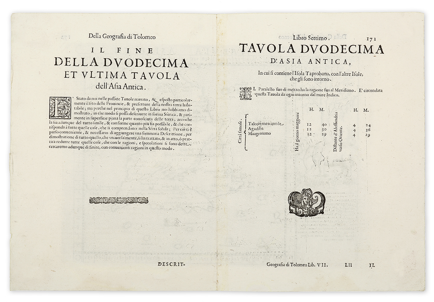 Early c.16th map of Sri Lanka named Taprobana, with a superb woodcut of the ‘Pascua Elephantum’ (an elephant at pasture) at the base of the Malli Mountains which Ptolemy described in his Geographia.