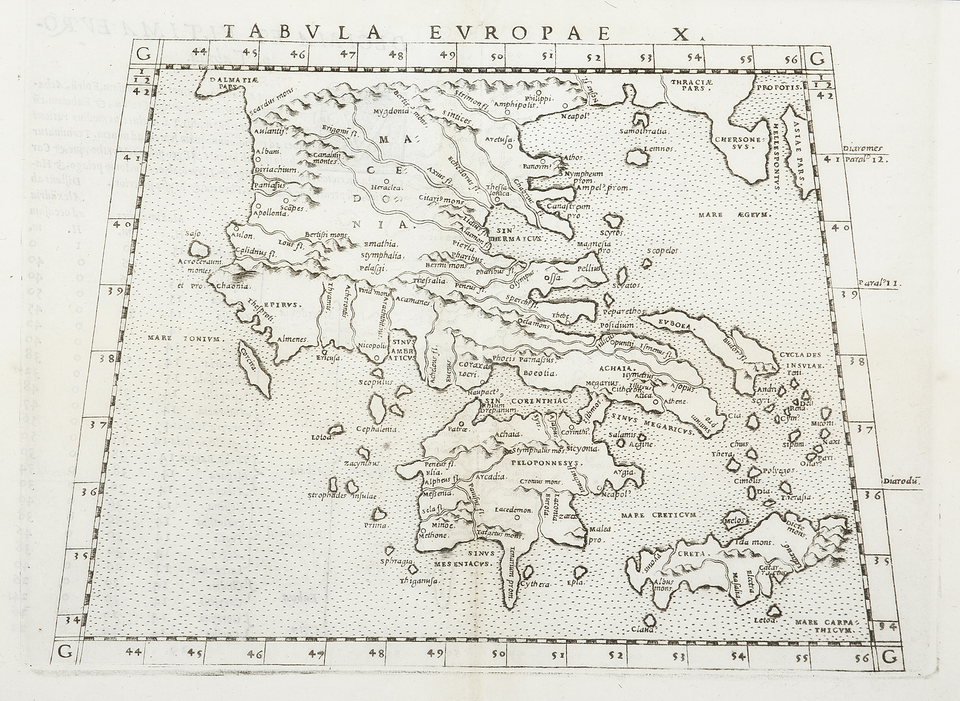 Famous c.16th Ptolemaic map of Greece, published by Vincenzo Valgrisi, Venice in 1562, revised and annotated by Josephus Moletius with a discourse by Girolamo Ruscelli. Latin text edition. The map was partly based on Jacopo Gastaldi.