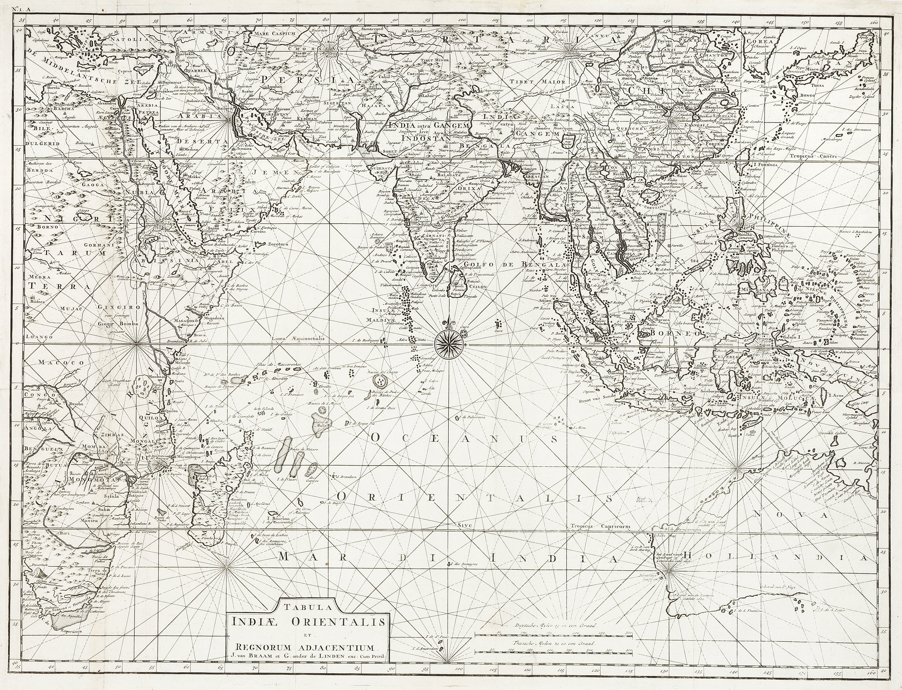The chart extends from Africa to Australia and covers the areas where the Dutch either directly controlled or traded. Valentyn had studied theology and travelled twice to the East Indies in the employ of the Dutch East India Company (V.O.C), firstly as a Calvinist minister on the spice island of Amboina (1686-1694) and then to Java (1706) and again Amboina (1707-1713). In the preparation of his historical account of the V.O.C. in the East, Valentyn was given privileged access to the secret archives of the company, enabling him to provide detailed information from primary sources such as log books of previous Dutch voyages to the Indies, including those of Abel Tasman. Australia is shown with the following Dutch discoveries; 1606 Jansz (the first European discovery and landing of Australia), 1616 Hartog, 1619 Houtman, 1622 Triall Islands, 1622 van Leeuwin, 1623 Carstensz, 1628 de Witt, 1623, Colster, 1627 Nuyts, 1642-3 Tasman