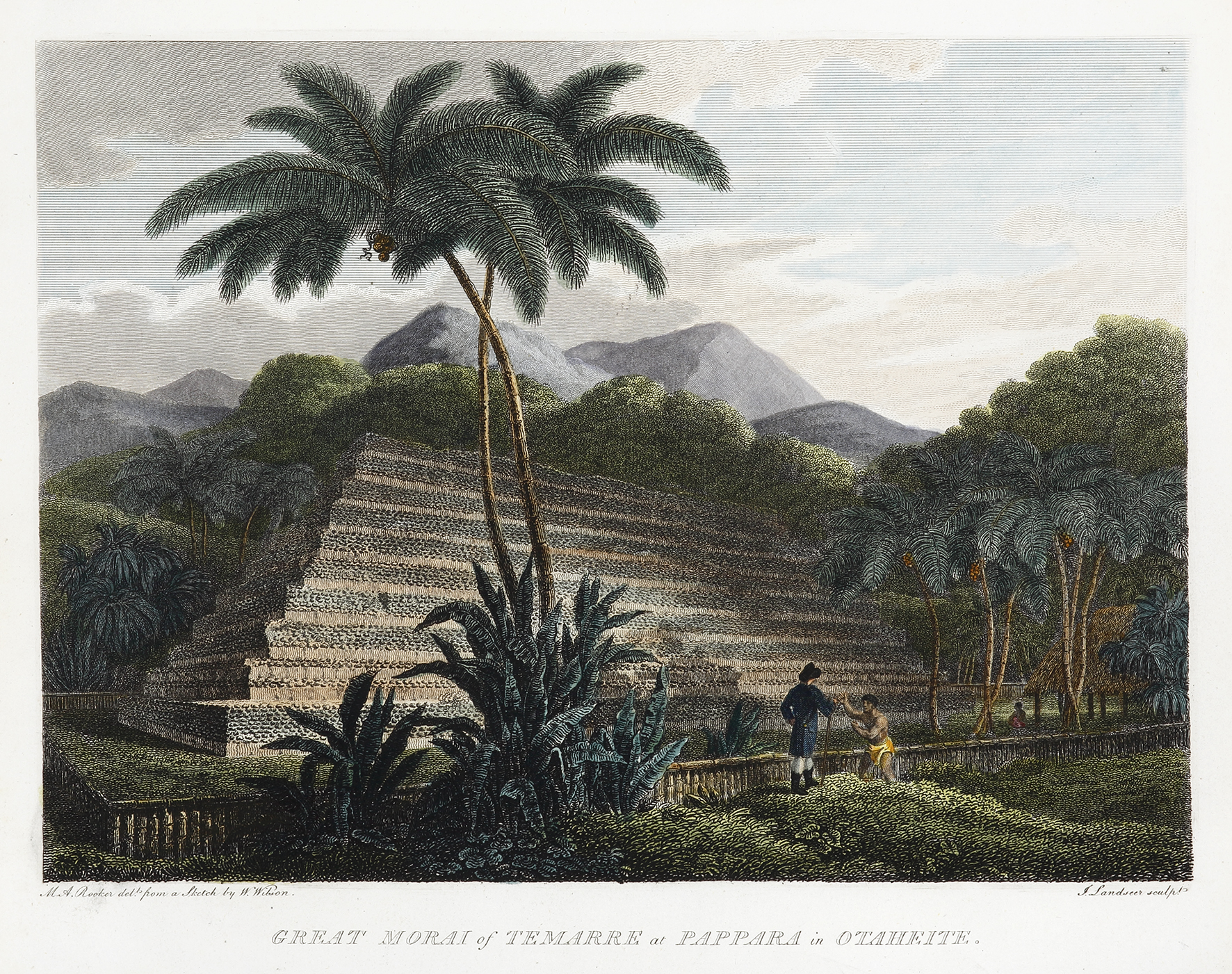 Rare c.18th engraving of a large graduated stone morai surrounded by a low fence and coconut and other trees in Tahiti. This morai was first described by James Cook in 1769, as being 130 x 80 feet and 40 feet high, made of coral blocks. From the first missionary voyage to the Pacific in the ship Duff, under the command of Captain James Wilson.
