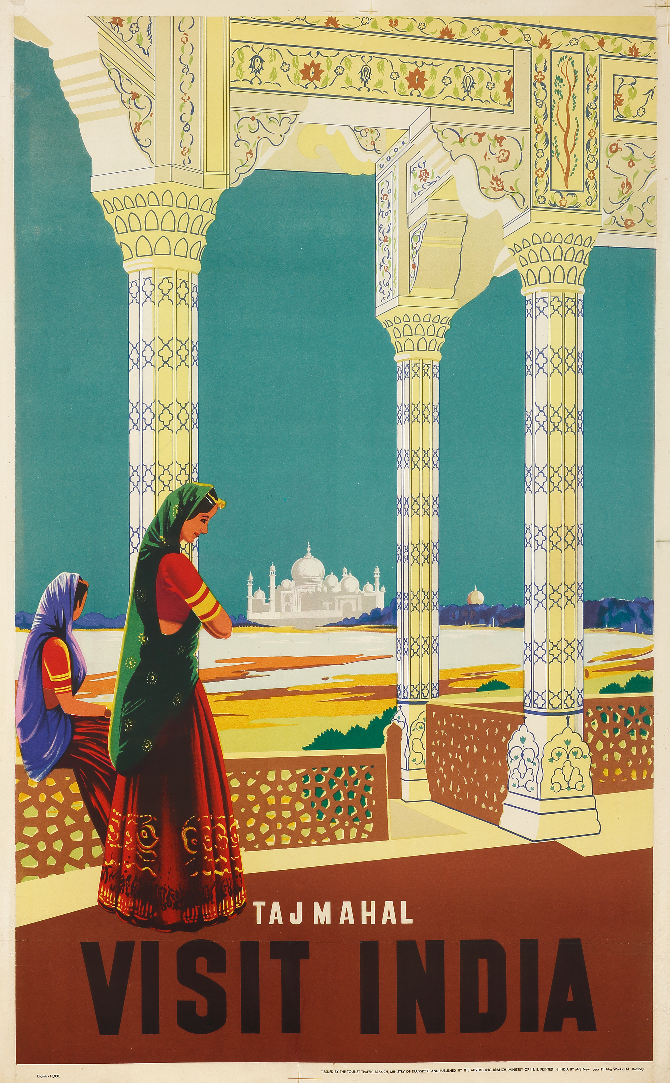 Rare India travel poster featuring the Taj Mahal issued by the Tourist Traffic Branch, Ministry of Transport and Published by the Advertising Branch, Ministry of I. & RB. printed in India by M/S Bombay Fine Art Offset & Litho Works, Bombay.