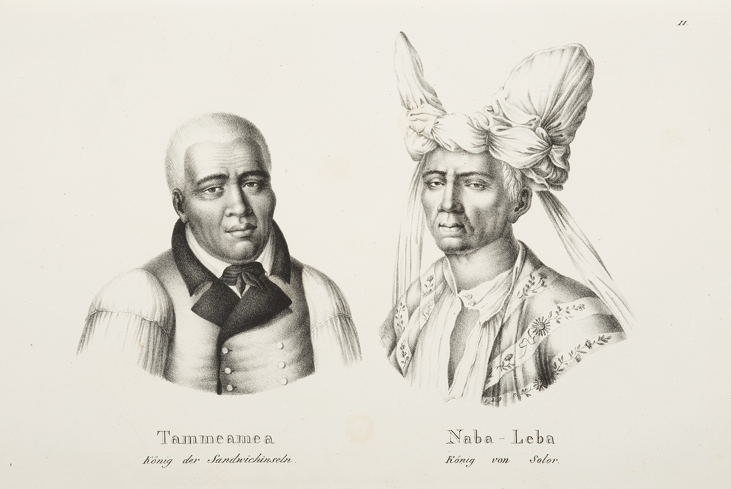 Left: Portrait of Kamehameha I (Tammeamea), founder of the Kingdom of Hawaii. Right: Portrait of Naba-Leba was based on the engraving issued in the account of the Baudin expedition. The title when first issued was: Naba-Leba Roi de Ile Solor … Read Full Description