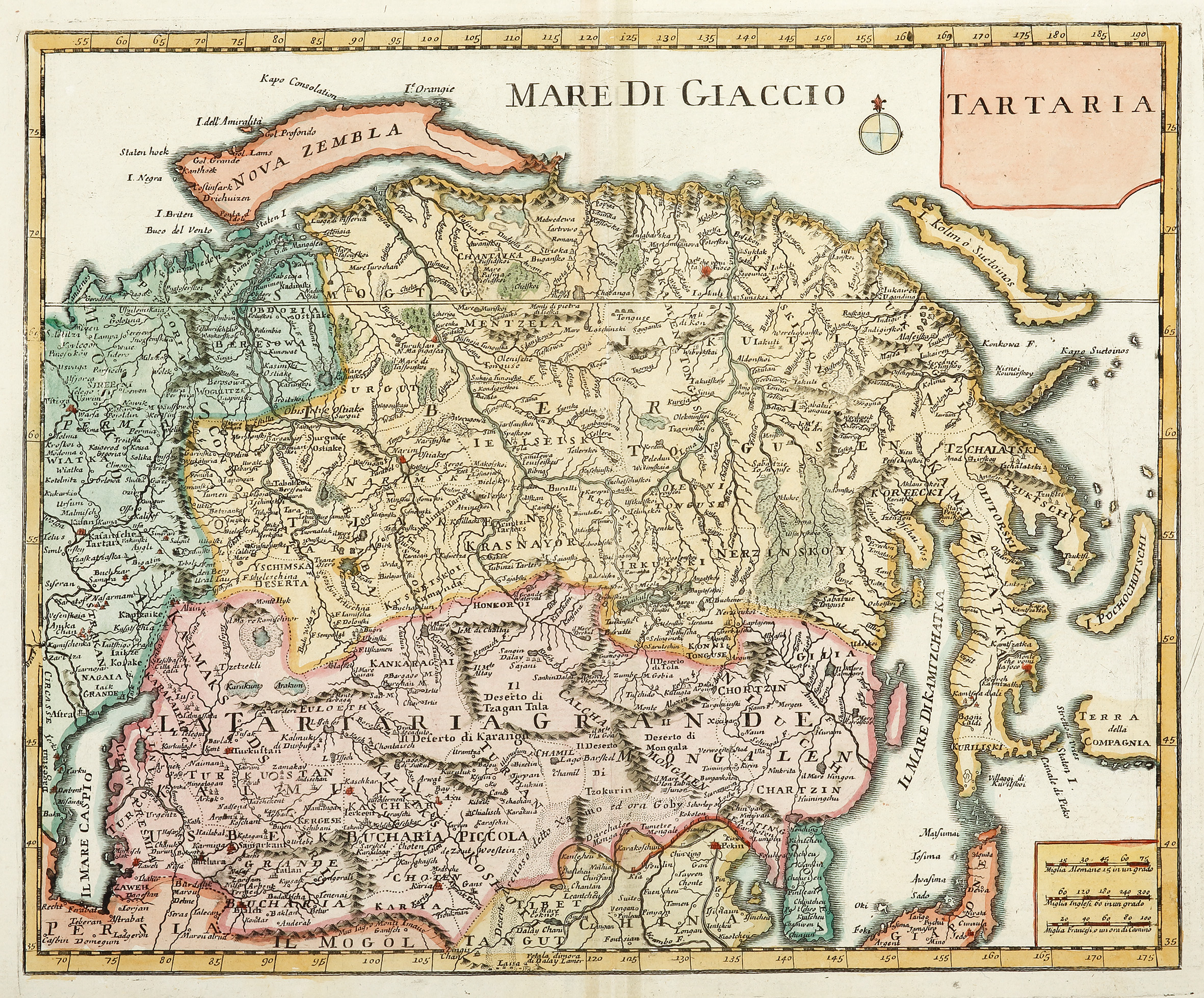 Exquisite map of central Asia and Siberia by Giovambattista Albrizzi, publisher, patron, collector and one of the great figures of eighteenth-century Venetian intellectual and cultural life.
