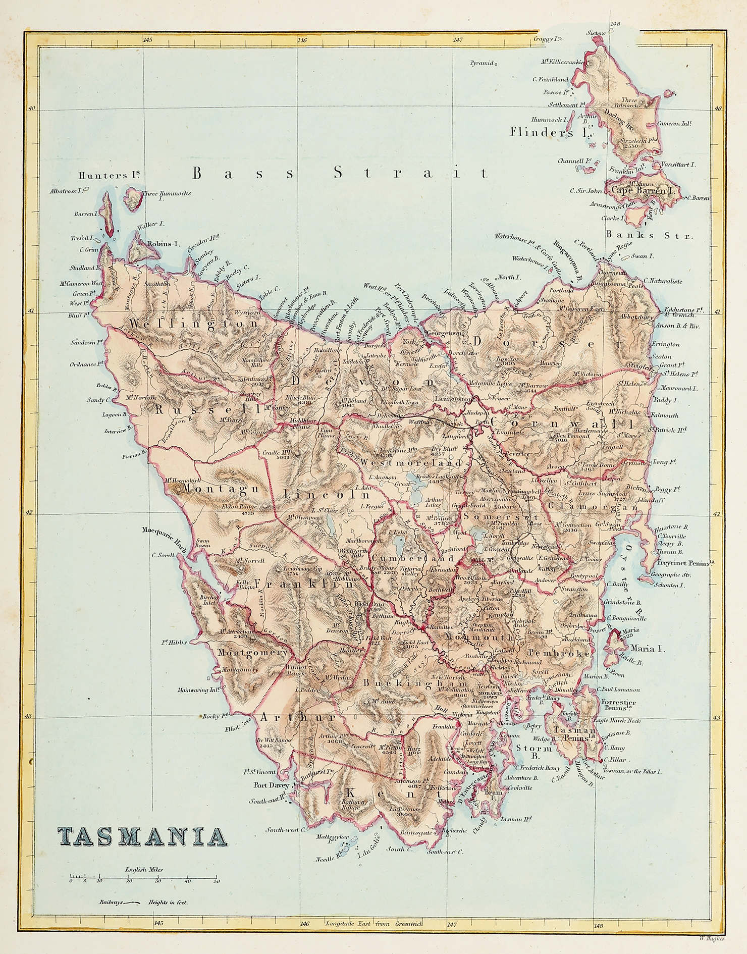 Detailed c.19th hand coloured engraved map of Tasmania.