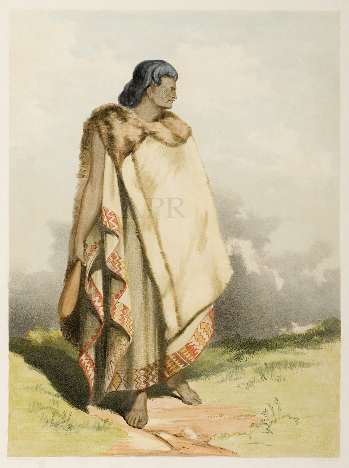 His face is in profile, and he wears a flax cloak (Kaitaka Paepaeroa) with a taniko (woven border). In his right hand is a greenstone mere. The associated text states: ‘Rangihaeta’s name may be translated ‘The heavenly dawn’. He is chief of the Ngatitoa tribe, and both from descent and energy of character, is the most influential native in the Southern district of New Zealand. He is related to the late Te Rauperaha, whose fighting chief he was, and both were in arms against us. The fortified Pah of Pahatanui was constructed under Rangihaeta’s direction, and considerable knowledge in the art of War was displayed in its fortification. Both Te Rangihaeata and Te Rauperaha are unpleasantly associated in the minds of the Colonists, as being prime movers in the ‘untoward event’ which is known as the Wairau Massacre. Te Rangihaeata had not embraced Christianity up to the time of my departure, and still affected to despise the Manners, Customs, Arts and Religion of the Pakehas.” Other Notes : The original watercolour for this lithograph is held in the Fletcher-Challenge collection, Auckland, purchased 29 March 1995. The artist has the subject’s title correctly spelled with an R (although missing its third a) in the captions at the front of the volume, but the lithographer has misspelled the name with an N underneath the image. Rangihaeata is the modern spelling for the name. It was often rendered as Rangihaeta by Europeans during Te Rangihaeata’s lifetime.