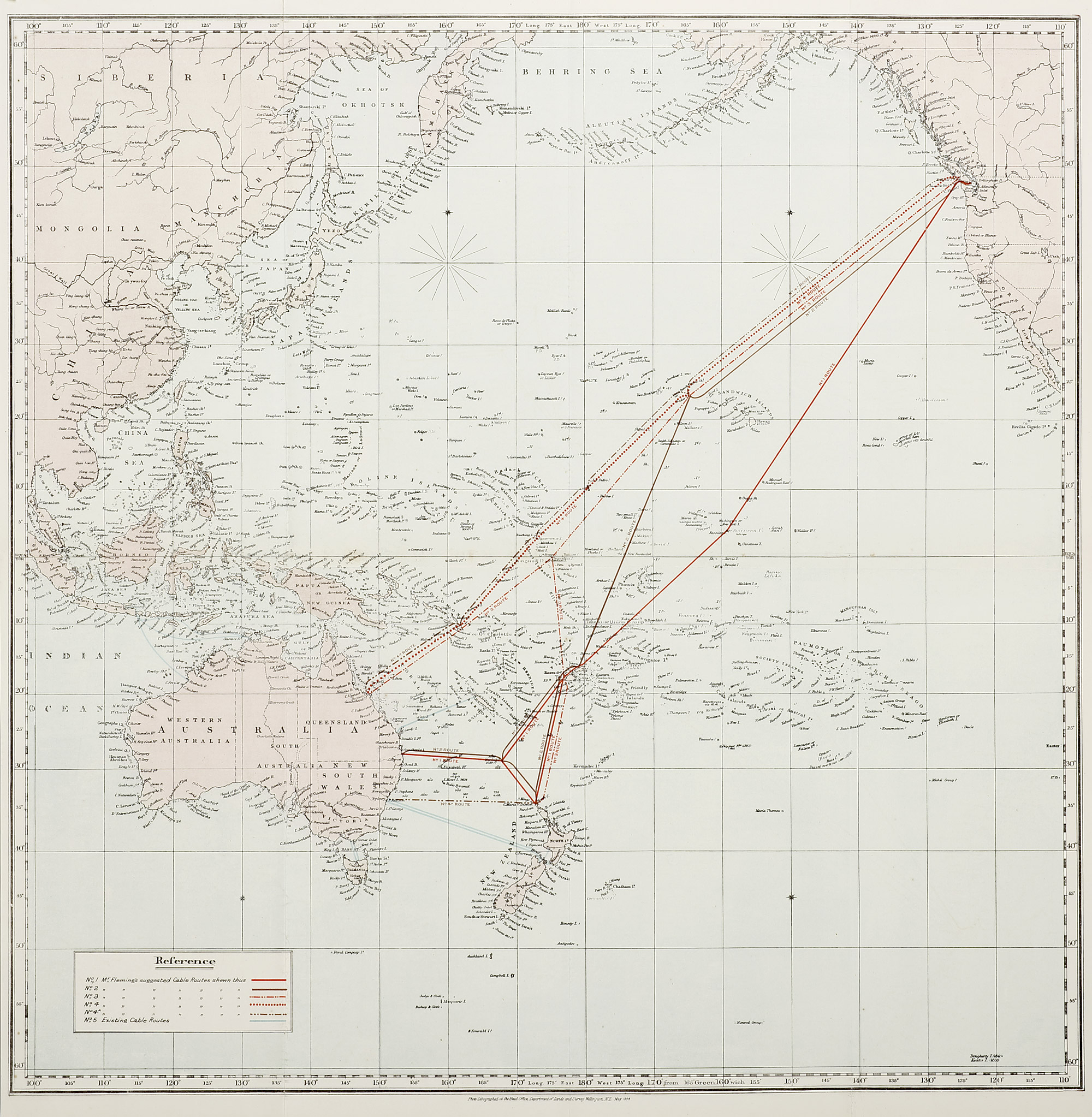 Very detailed c.19th large scale map of the proposed and existing cable routes from Australia to Vancouver. Printed in Wellington, New Zealand May 1894.