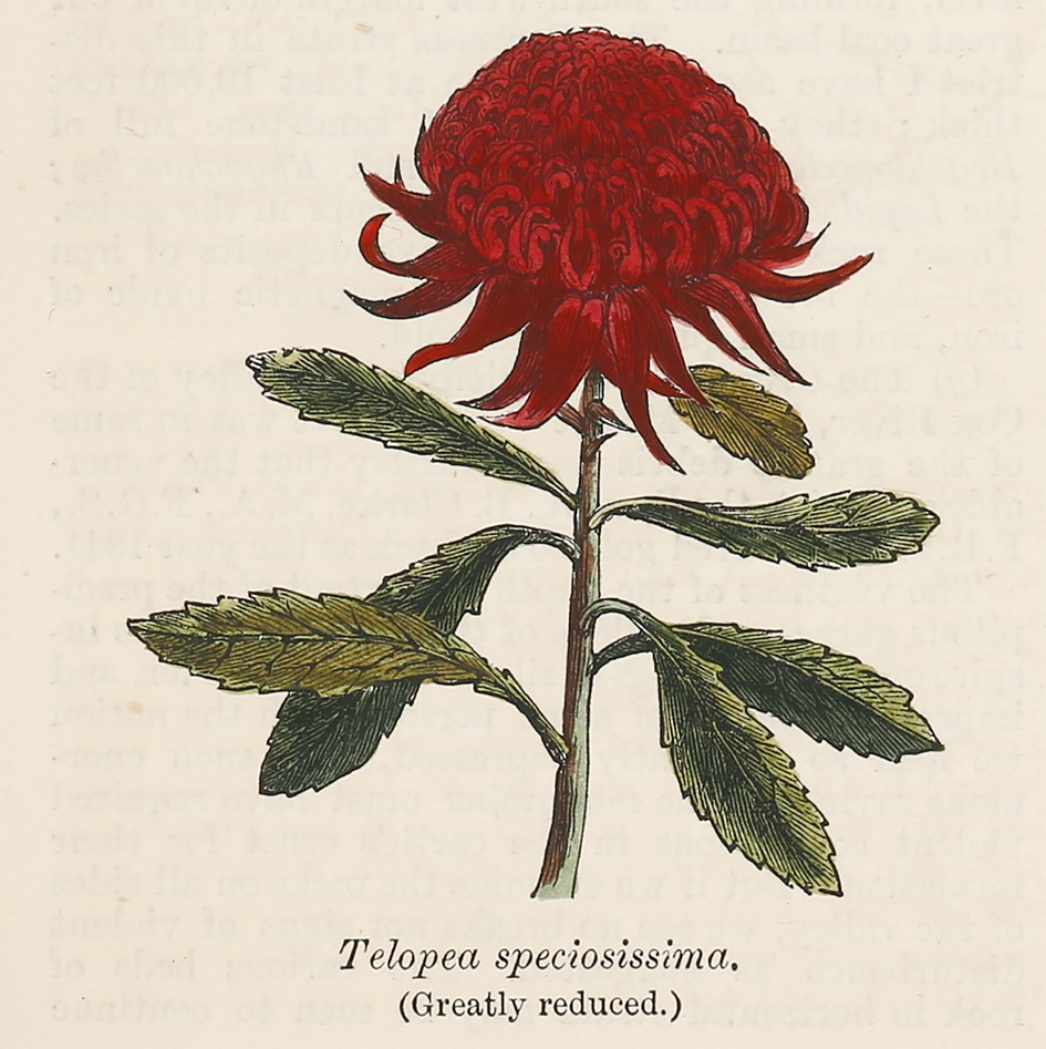 The Waratah was first described by botanist James Edward Smith in A Specimen of the Botany of New Holland, 1793 from “very fine dried specimens sent by Mr. White’. He gave the species its original binomial name of Embothrium speciosissimum, Robert Brown suggested the genus Telopea for it in 1809, which was published in 1810.
