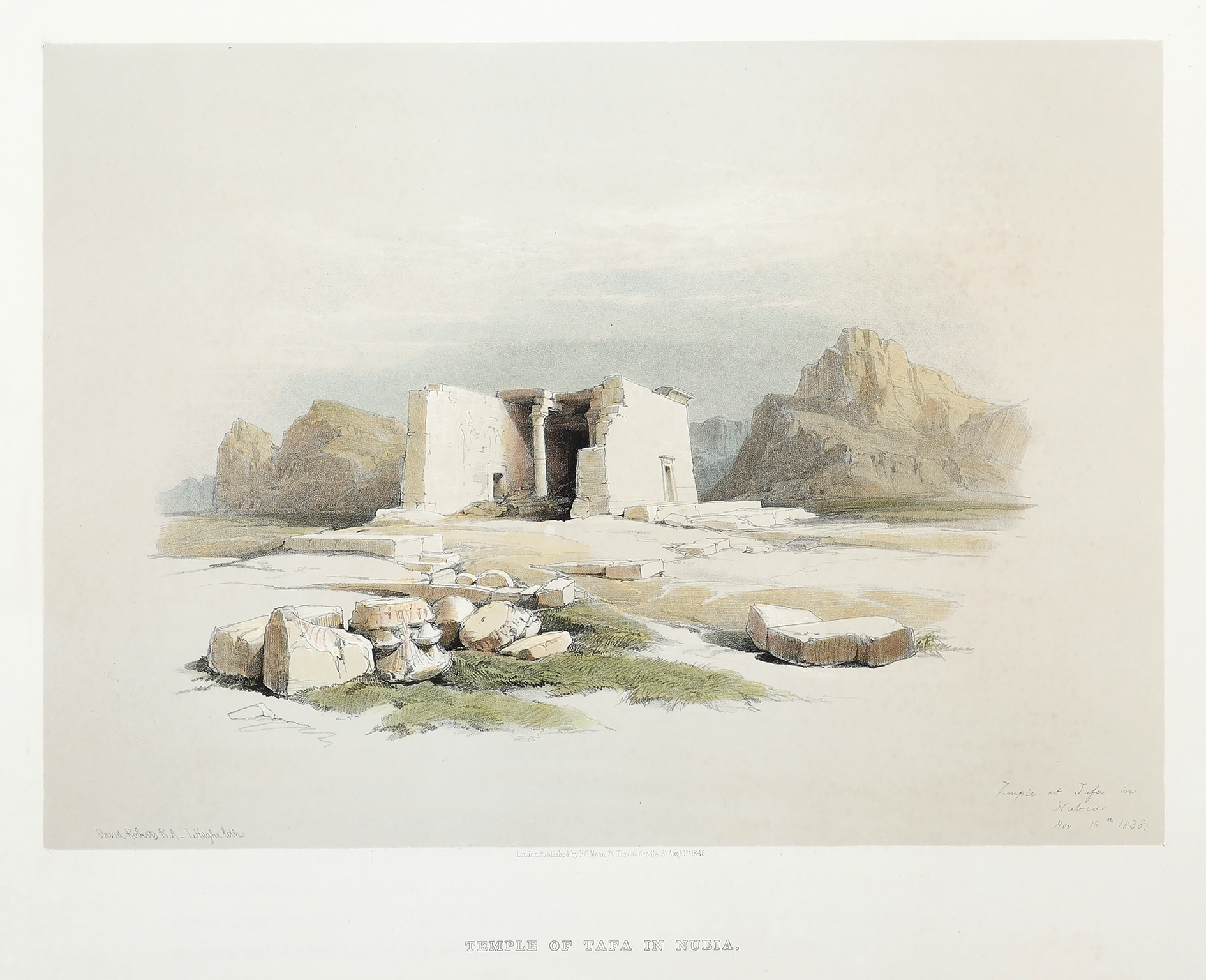 Rare c.19th lithograph of the southern Temple of Tefah by David Roberts who was the first professional artist to visit the Near East without a patron or a connection to a military expedition or missionary group. The temples of Taffa (Tefah) were built in Roman times. The southern of the two temples mentioned here was destroyed in the late c.19th, what remained of the remaining Northern temple of Taffa was presented to the people of the Netherlands by Egypt in appreciation of their assistance in the rescue of Nubian temples in the 1960’s and is now located in the Rijksmuseum van Oudheden in Leiden.