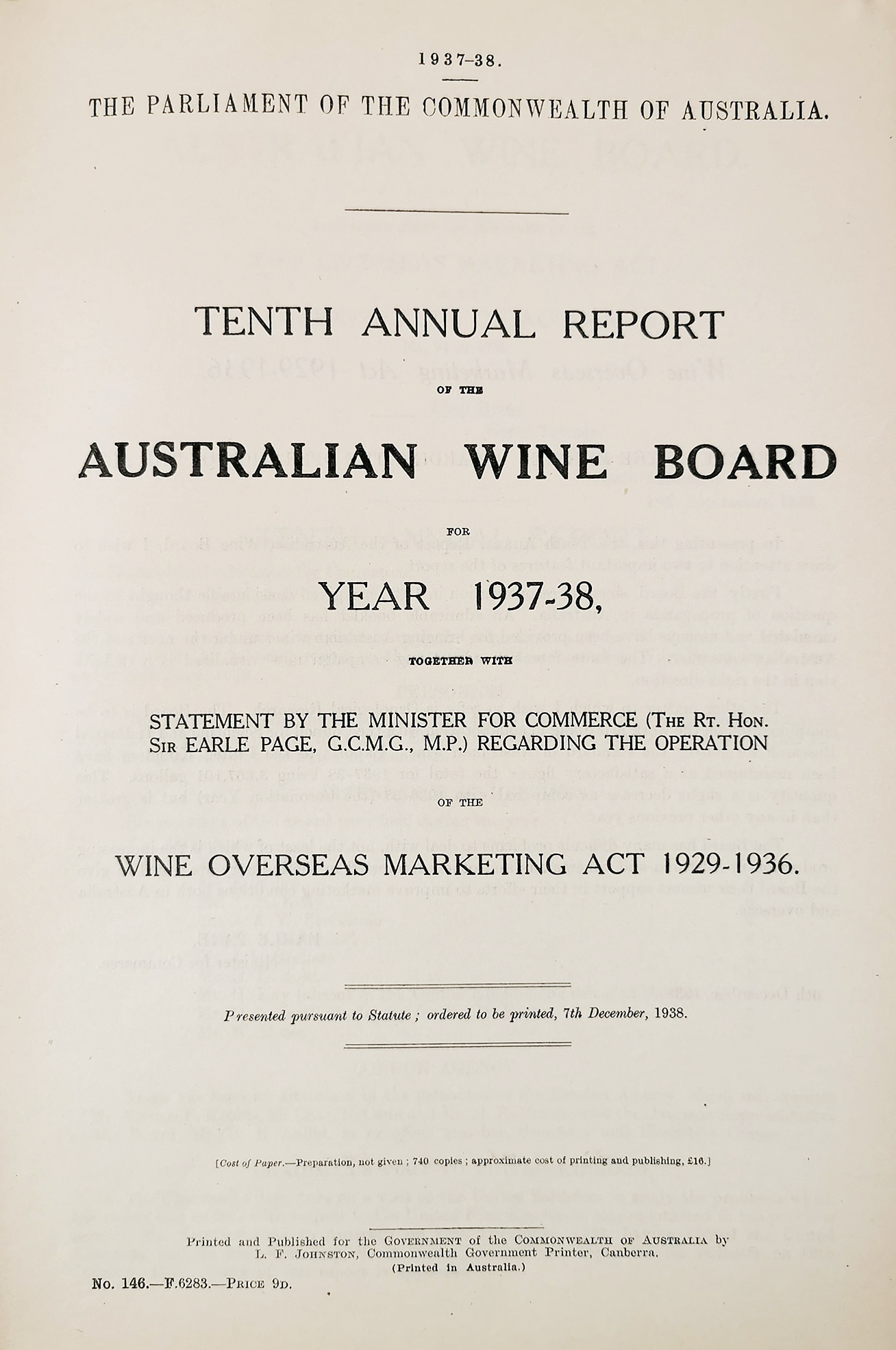 Tenth Annual Report of the Wine Overseas Marketing Board for 1938. The report includes details of annual output and issues of marketing Australian wine overseas. Thirteen pages, soft bound.